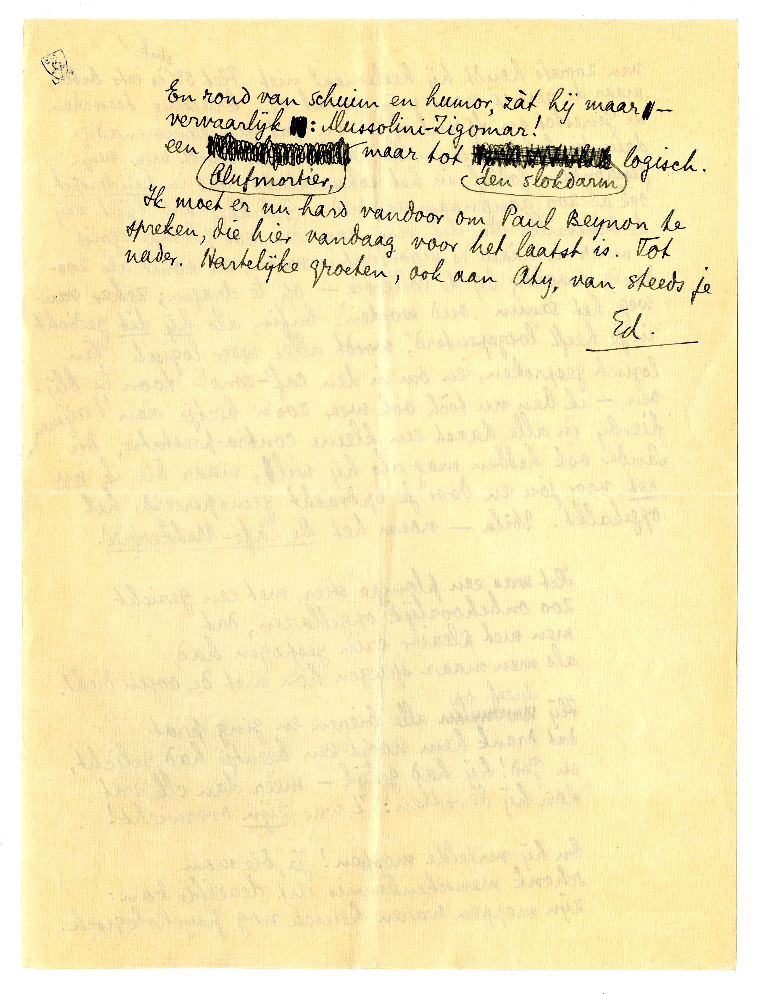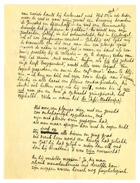 Neen, doktersbemoediging is het niet geweest; ik vind die Uitverkoop2006 werkelijk heel aardig - zooals je uit de ‘detail-kritiek’ trouwens nog eens hebt kunnen merken. Van de 3 verzen die ik vandaag kreeg, vind ik Kinderspel heelemaal niets; niet goed of slecht, maar gewoon niets, een ‘aardigheidje’. Dit is wat Jany wschl. niet geserreerd genoeg vindt. Het gevaar voor jou is: als je poëzie heelemààl kamermuziek of café chantant wordt, heelemààl Paul Delmat of Raoul Ponchon.2007 Toulet is geen van de 2: zijn grammaticale ge voelig/compliceerd heid redt hem, Corbière neigt naar het tweede, soms, maar zijn natuurlijke ferociteit redt hem - jij, als je niet oppast, wordt zóó ‘gewoon’ en ‘vloeiend’, dat je soms opeens midden in de twee genres tegelijk zit. Laus Autumni (ik vind deze titel beroerd en onjuist, bovendien heb je al een Laus Castitatis, ik zou er niet zooveel lauzen bij doen) is ook al chanson-achtig, maar vind ik, desondanks, toch heel aardig. Maar Kinderspel ben je op je ergst; drie slappe kwatrijnen, en dat vriendelijke grapje aan het slot, waar ‘Hein’2008 voor de variatie ‘Heinoom’ wordt genoemd, is toch wel erg flauw. Ik zou zoo'n krabbeltje in jouw plaats desnoods wel ergens in een tijdschrift zetten, maar juist niet in een bundel opnemen. De Vroolijke Elegie vind ik lang niet kwaad, met dat terugkeerende rijm op -aan. Voor Forum 32009 (maar kan je zoo lang wachten?!) zou ik dus die ‘herfstluis’ wel willen hebbenen; en misschien dan nog Interieur? (Ik zal wachten met verzenden van dezen brief, tot die komt.) Zend Coenen dan De Lafaard en Kinderspel.2010 Komt dat ééne gedicht, Winterdienst, nu in De Gids? Ik ben fel benieuwd naar dit ééne, uitverkorene!
