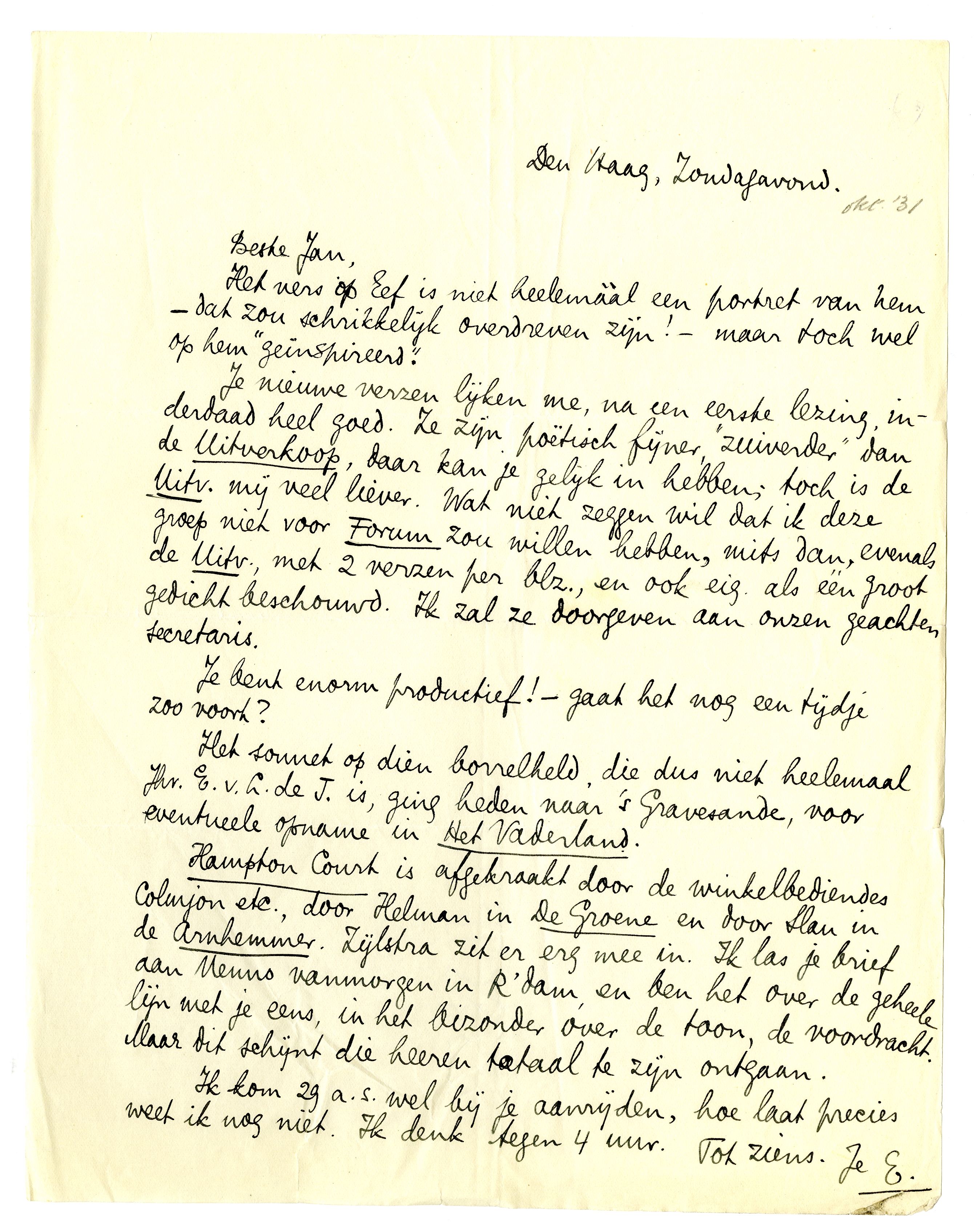 Je nieuwe verzen lijken me, na een eerste lezing, inderdaad heel goed. Ze zijn poëtisch fijner, ‘zuiverder’ dan de Uitverkoop, daar kan je gelijk in hebben; toch is de Uitv. mij veel liever. Wat niet zeggen wil dat ik deze groep niet voor Forum zou willen hebben, mits dan, evenals de Uitv., met 2 verzen per blz., en ook eig. als één groot gedicht beschouwd. Ik zal ze doorgeven aan onzen geachten secretaris.