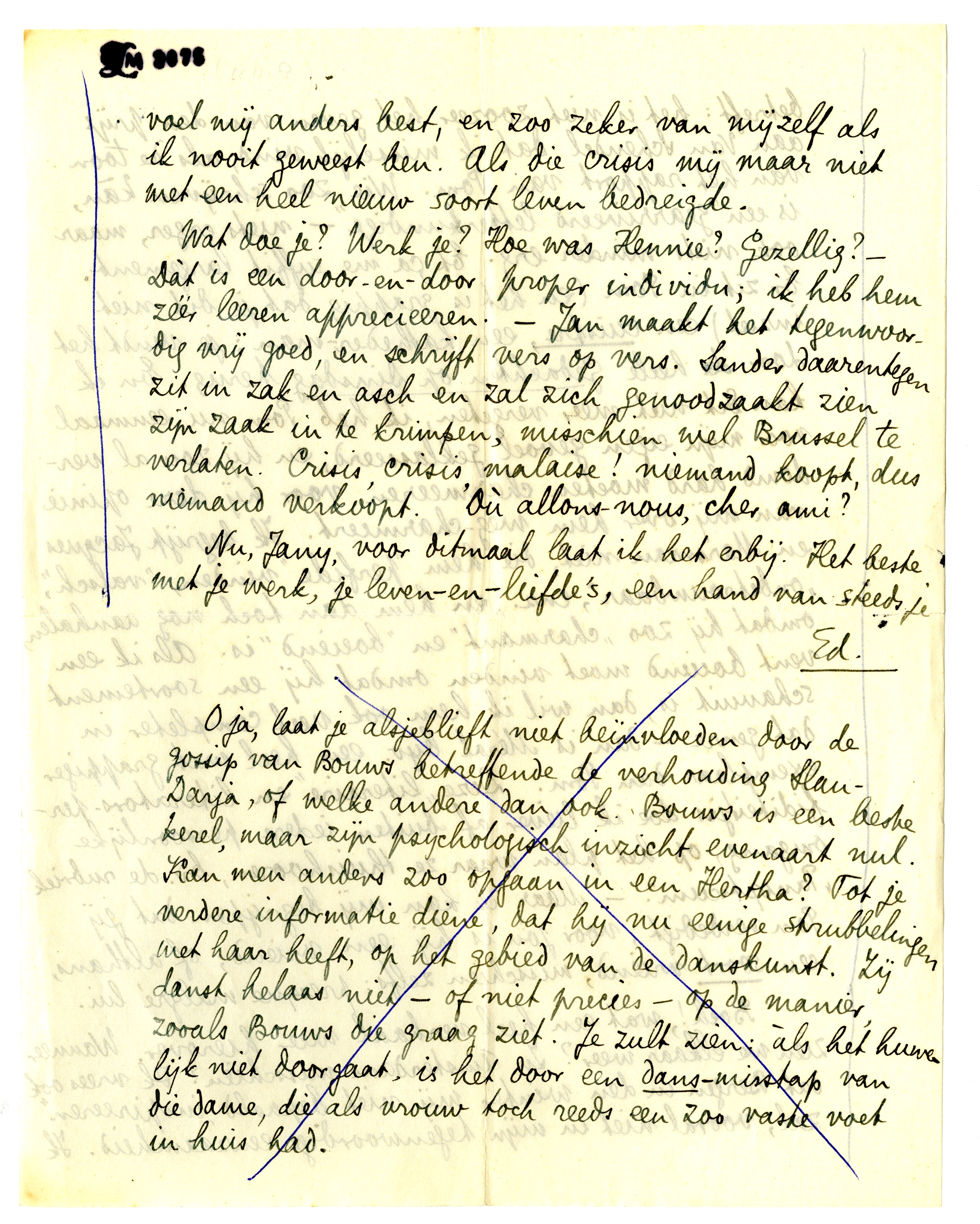 Wat doe je? Hoe was Hennie? Gezellig? - Dàt is een door-en-door proper individu; ik heb hem zéér leeren apprecieeren. - Jan maakt het tegenwoordig vrij goed, en schrijft vers op vers. Sander daarentegen zit in zak en asch en zal zich genoodzaakt zien zijn zaak in te krimpen, misschien wel Brussel te verlaten. Crisis, crisis, malaise! niemand koopt, dus niemand verkoopt. Où allons-nous, cher ami?