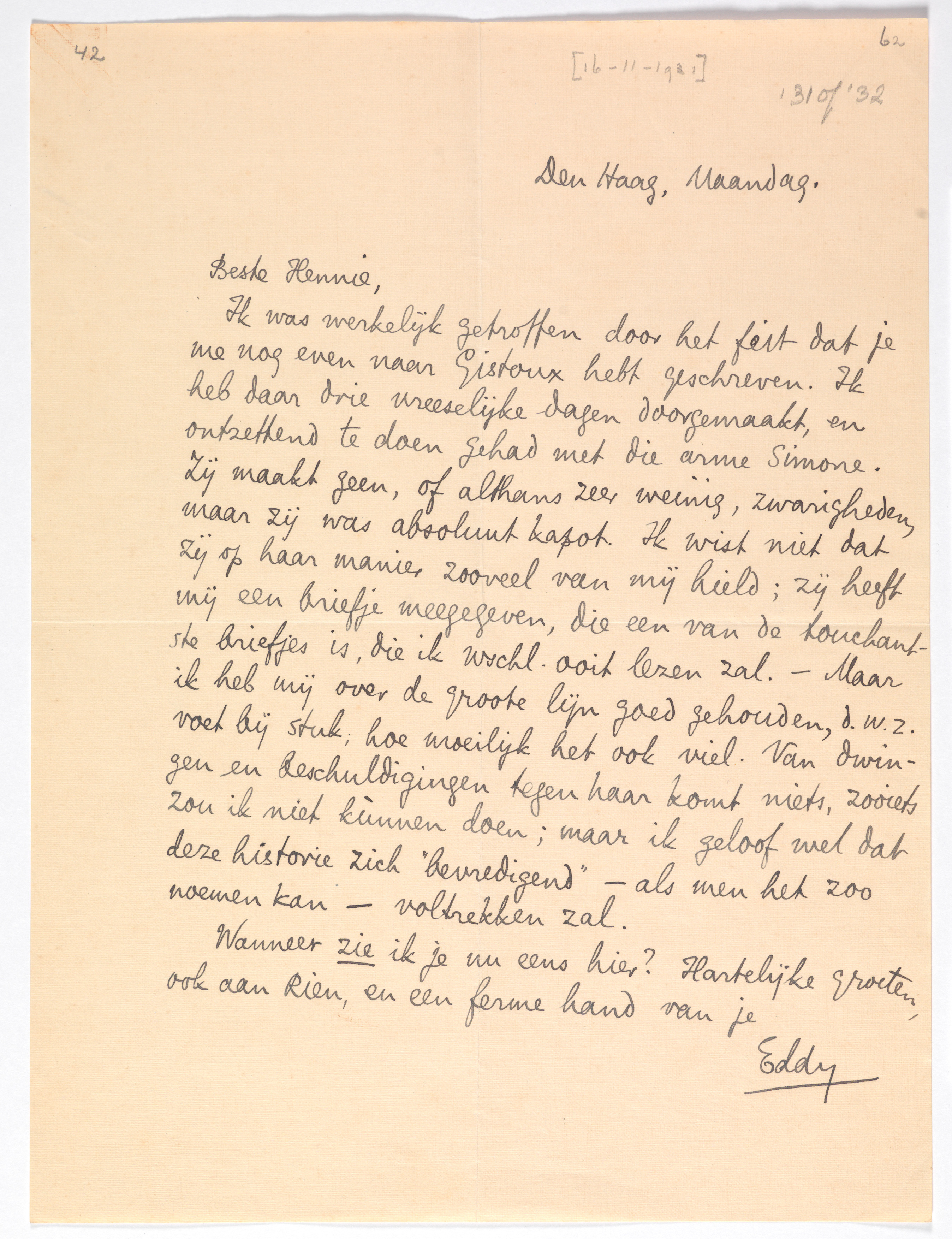 Ik was werkelijk getroffen door het feit dat je me nog even naar Gistoux hebt geschreven. Ik heb daar drie vreeselijke dagen door-gemaakt, en ontzettend te doen gehad met die arme Simone. Zij maakt geen, of althans zeer weinig, zwarigheden, maar zij was absoluut kapot. Ik wist niet dat zij op haar manier zooveel van mij hield; zij heeft mij een briefje meegegeven, die een van de touchantste briefjes is, die ik wschl. ooit lezen zal. - Maar ik heb mij over de groote lijn goed gehouden, d.w.z. voet bij stuk; hoe moeilijk het ook viel. Van dwingen en beschuldigingen tegen haar komt niets, zooiets zou ik niet kùnnen doen; maar ik geloof wel dat deze historie zich ‘bevredigend’ - als men het zoo noemen kan - voltrekken zal.