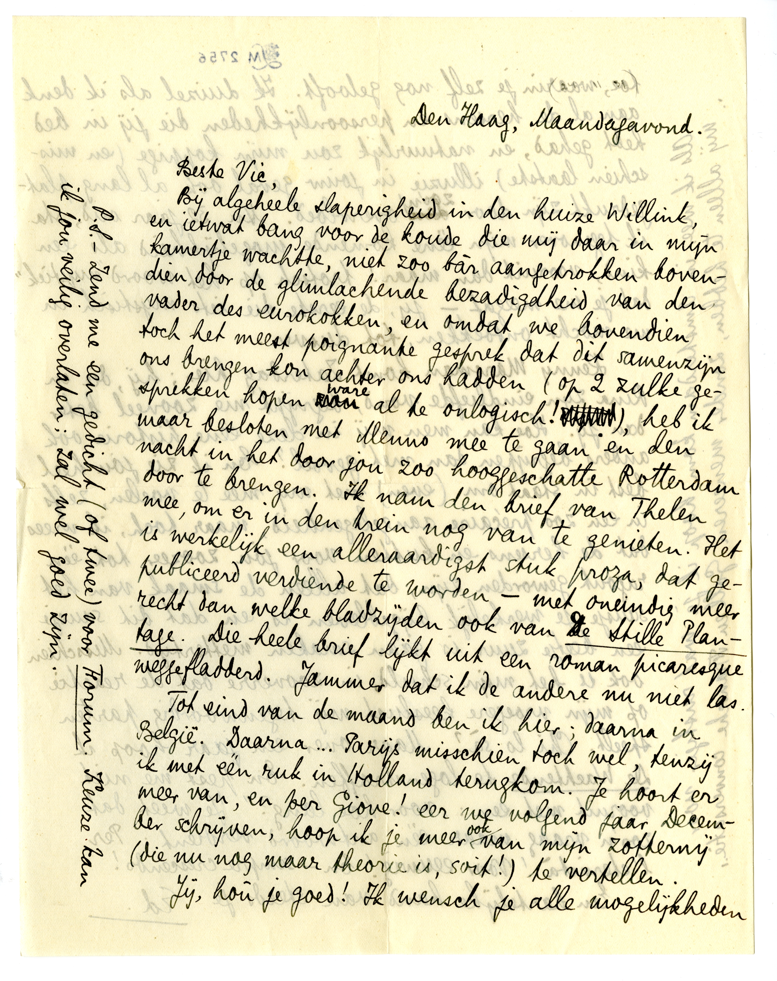 Bij algeheele slaperigheid in den huize Willink, en ietwat bang voor de koude die mij daar in mijn kamertje wachtte, niet zoo bàr aangetrokken bovendien door de glimlachende bezadigdheid van den vader des eurokokken,2028 en omdat we bovendien toch het meest poignante gesprek dat dit samenzijn ons brengen kon achter ons hadden (op 2 zulke gesprekken hopen ware al te onlogisch!), heb ik maar besloten met Menno mee te gaan en den nacht in het door jou zoo hooggeschatte Rotterdam door te brengen. Ik nam den brief van Thelen2029 mee, om er in den trein nog van te genieten. Het is werkelijk een alleraardigst stuk proza, dat gepubliceerd verdiende te worden - met oneindig meer recht dan welke bladzijden ook van De Stille Plantage. Die heele brief lijkt uit een roman picaresque weggefladderd. Jammer dat ik de andere nu niet las.