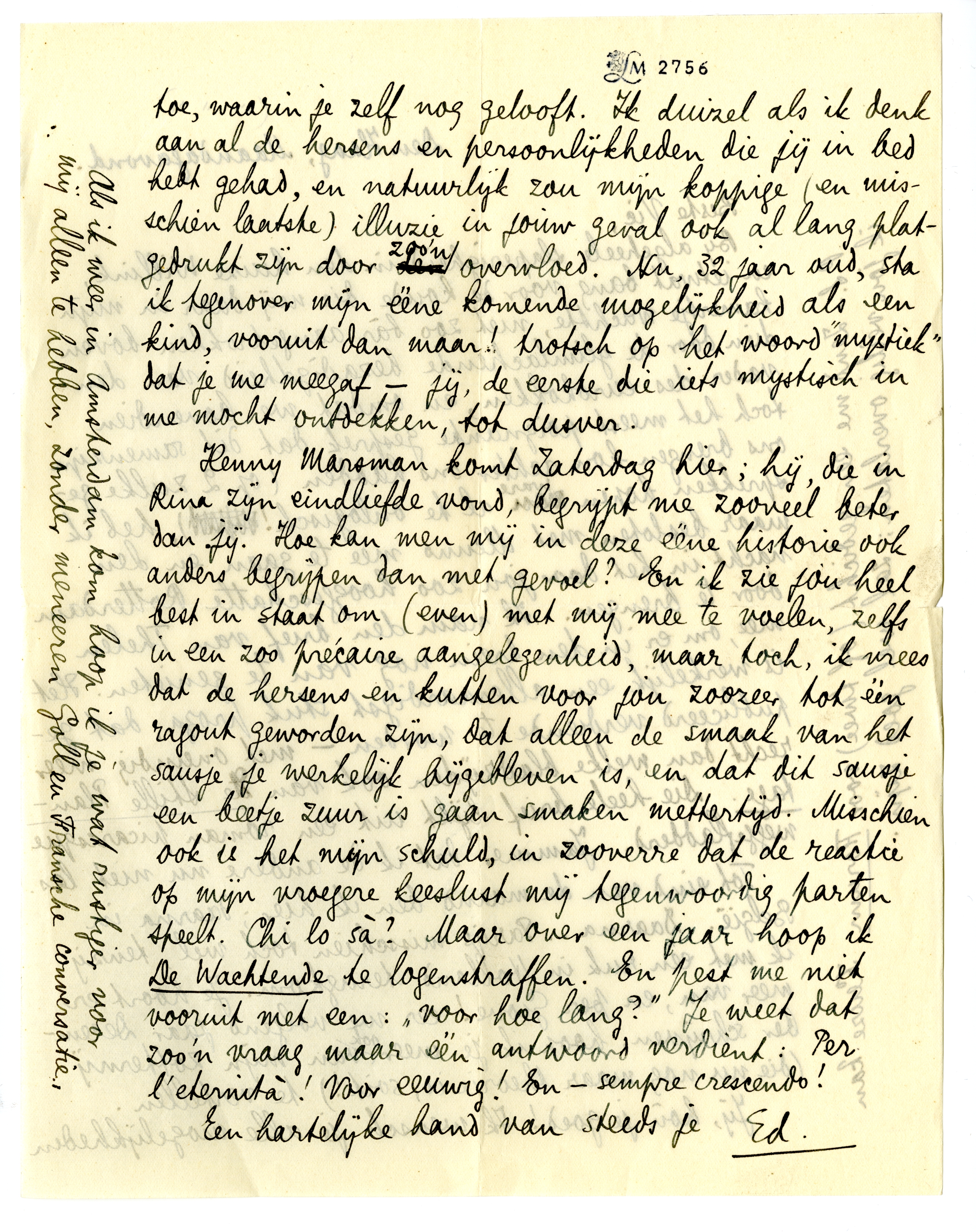 Henny Marsman komt Zaterdag hier; hij, die in Rina zijn eindliefde vond, begrijpt me zooveel beter dan jij. Hoe kan men mij in deze ééne historie ook anders begrijpen dan met gevoel? En ik zie jou heel best in staat om (even) met mij mee te voelen, zelfs in een zoo précaire aangelegenheid, maar toch, ik vrees dat de hersens en kutten voor jou zoozeer tot één ragout geworden zijn, dat alleen de smaak van het sausje je werkelijk bijgebleven is, en dat dit sausje een beetje zuur is gaan smaken mettertijd. Misschien ook is het mijn schuld, in zooverre dat de reactie op mijn vroegere keeslust mij tegenwoordig parten speelt. Chi lo sà? Maar over een jaar hoop ik De Wachtende te logenstraffen. En pest me niet vooruit met een: ‘voor hoe lang?’ Je weet dat zoo'n vraag maar één antwoord verdient: Per l'eternità! Voor eeuwig! En - sempre crescendo!