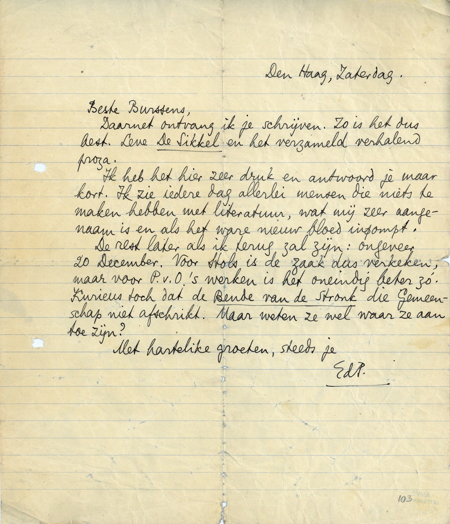 Daarnet ontvang ik je schrijven. Zo is het dus best. Leve De Sikkel en het verzameld verhalend proza.