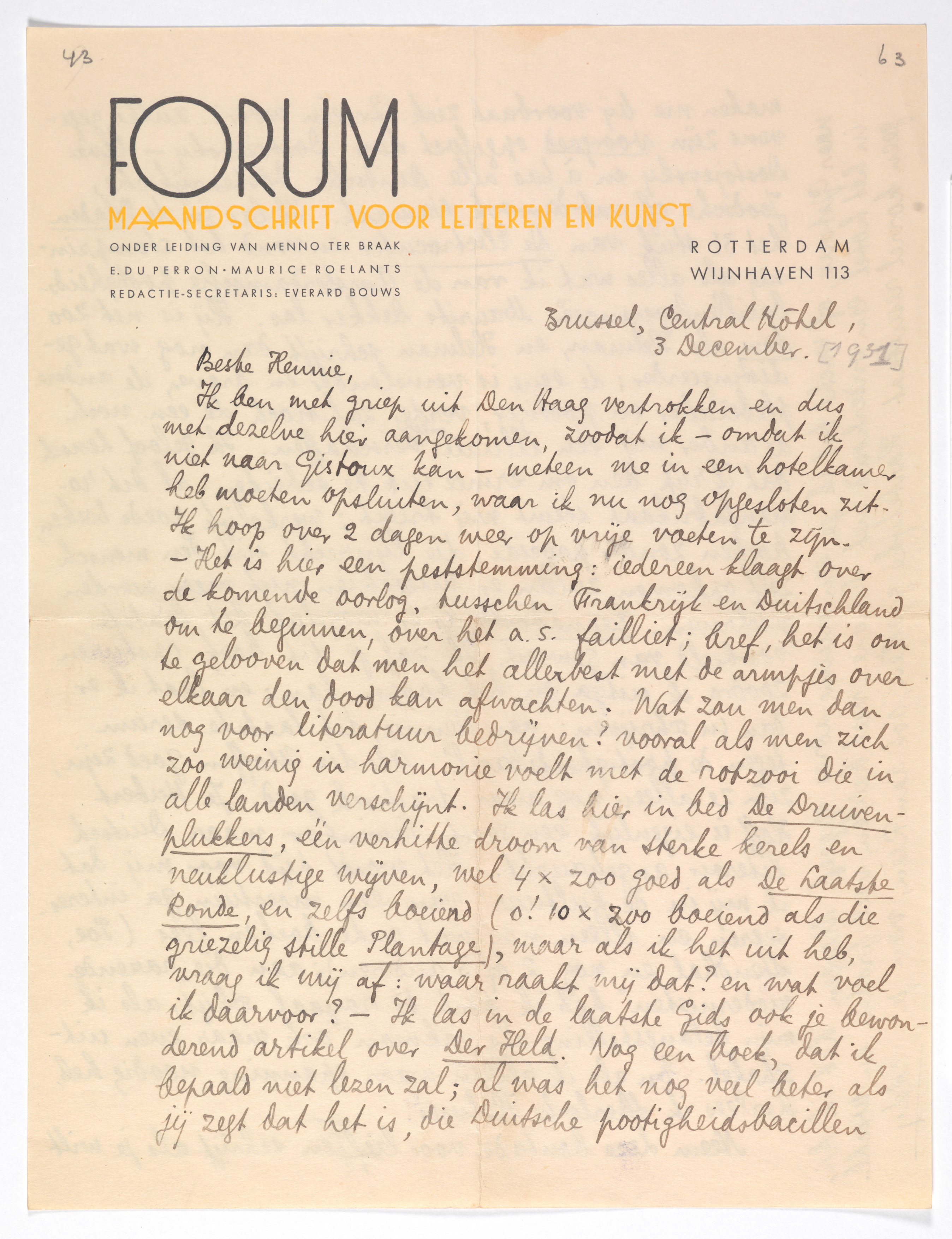 Ik ben met griep uit Den Haag vertrokken en dus met dezelve hier aangekomen, zoodat ik - omdat ik niet naar Gistoux kan - meteen me in een hotelkamer heb moeten opsluiten, waar ik nu nog opgesloten zit. Ik hoop over 2 dagen weer op vrije voeten te zijn. - Het is hier een peststemming: iedereen klaagt over de komende oorlog, tusschen Frankrijk en Duitschland om te beginnen, over het a.s. failliet; bref, het is om te gelooven dat men het allerbest met de armpjes over elkaar den dood kan afwachten. Wat zou men dan nog voor literatuur bedrijven? vooral als men zich zoo weinig in harmonie voelt met de rotzooi die in alle landen verschijnt. Ik las hier in bed De Druivenplukkers, één verhitte droom van sterke kerels en neuklustige wijven, wel 4 × zoo goed als De Laatste Ronde, en zelfs boeiend (o! 10 × zoo boeiend als die griezelig stille Plantage), maar als ik het uit heb, vraag ik mij af: waar raakt mij dat? en wat voel ik daarvoor? - Ik las in de laatste Gids ook je bewonderend artikel over Der Held.2036 Nog een boek, dat ik bepaald niet lezen zal; al was het nog veel beter als jij zegt dat het is, die Duitsche pootigheidsbacillen maken me bij voorbaat ziek. In één woord: zulke gegevens zijn voorgoed opgelost door Dostojevsky - leve Dostojevsky en à bas alle Duitsche, Oostenrijksche, Joodsche of wat-dan-ook Namaak. Ik las in de Bladen het 3e stuk van De Electrocutie2037 en vond het stompzinnig als alles wat ik van de Amsterdamsche pootigheidsbacillenleverancier Maurits Dekker las. Hij is net zoo dom als Helman, en Helman schrijft dan nog wat gedistingeerder; de eene is vervelender en braver, de andere plebeïscher en pootiger, verder zal noch de een noch de ander mij één illuzie meer verschaffen. Ik geloof heusch dat ik rijp ben om ermee uit te scheiden: al dit romanfabrikaat stemt mij triest; werkelijk goede boeken, boeken zonder procédé, die lijnrecht uit den mensch zelf opkomen, zullen er misschien niet meer worden geschreven. Barnabooth is er mogelijk het laatste voorbeeld van ge-weest. Ik zal je dit boek opsturen zoodra ik uitga en het koopen kan; en laat ik er dan in schrijven: ‘aan Hennie, dit laatste serum tegen de pootigheidsbacil’. Als die Moffen goed zijn, zijn ze alleen nog maar drastisch goed. Je Hubert Hoff2038 is eigenlijk een soort Sawinkov, maar Duitsch literair angehaucht. Het wordt tijd voor mij dat ik mij in de ‘kultuur’ van een moestuin ga interesseeren en alleen nog wat oude boeken lees (Poe, Stendhal en nog 2 of 3 anderen); aan die ‘razende modernisten’ heb ik toch tè royaal schijt, als ik mijn belangstelling als ‘vakman’ ook maar even uitschakel. En als ik alleen maar spanning noodig heb, herlees ik Sherlock Holmes.