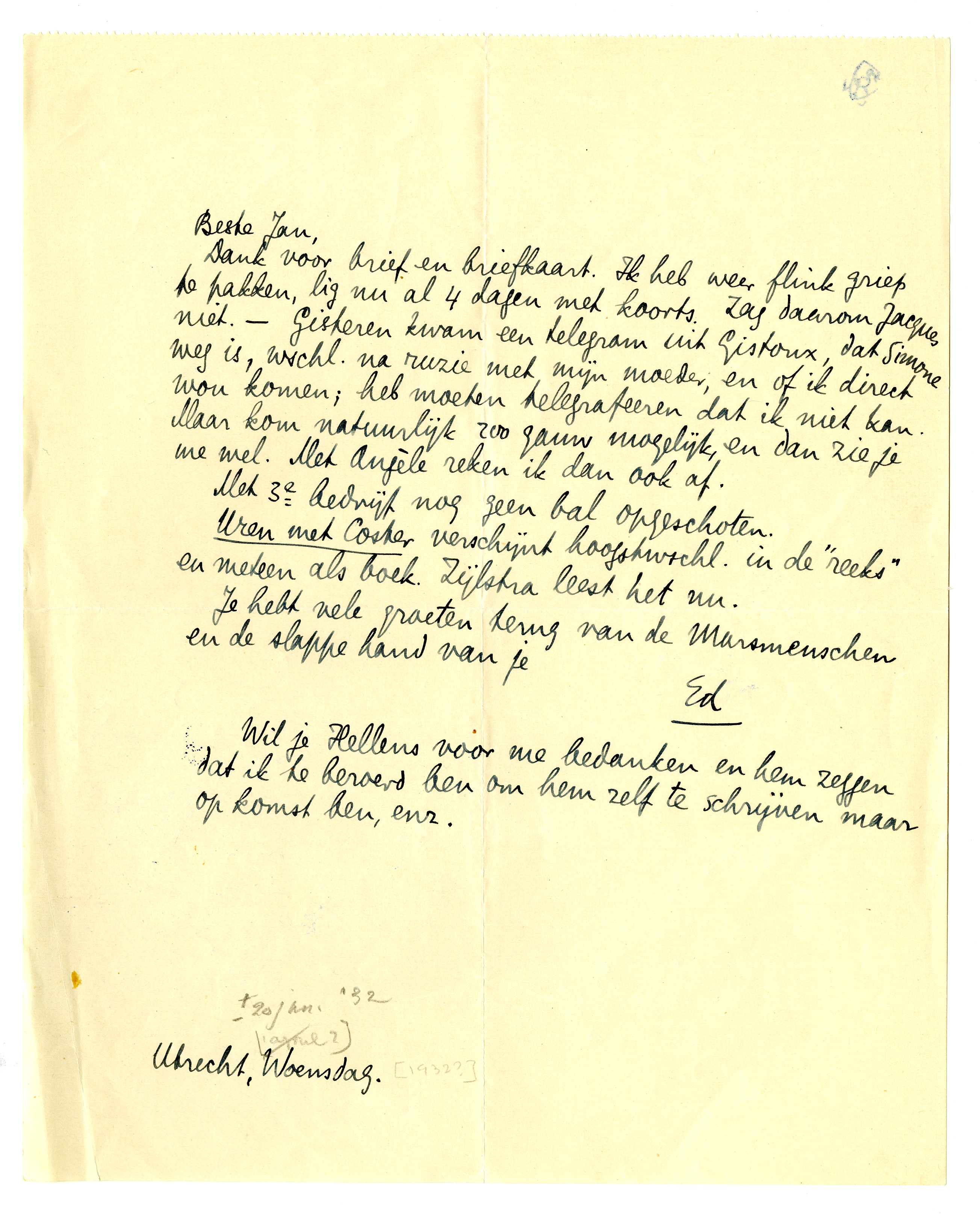 Dank voor brief en briefkaart. Ik heb weer flink griep te pakken, lig nu al 4 dagen met koorts. Zag daarom Jacques niet. - Gisteren kwam een telegram uit Gistoux, dat Simone weg is, wschl. na ruzie met mijn moeder, en of ik direct wou komen; heb moeten telegrafeeren dat ik niet kan. Maar kom natuurlijk zoo gauw mogelijk, en dan zie je me wel. Met Angèle reken ik dan ook af.