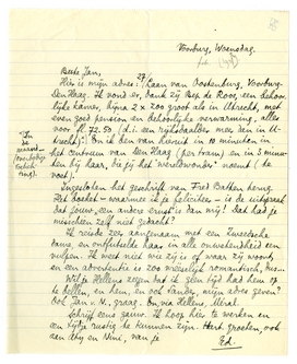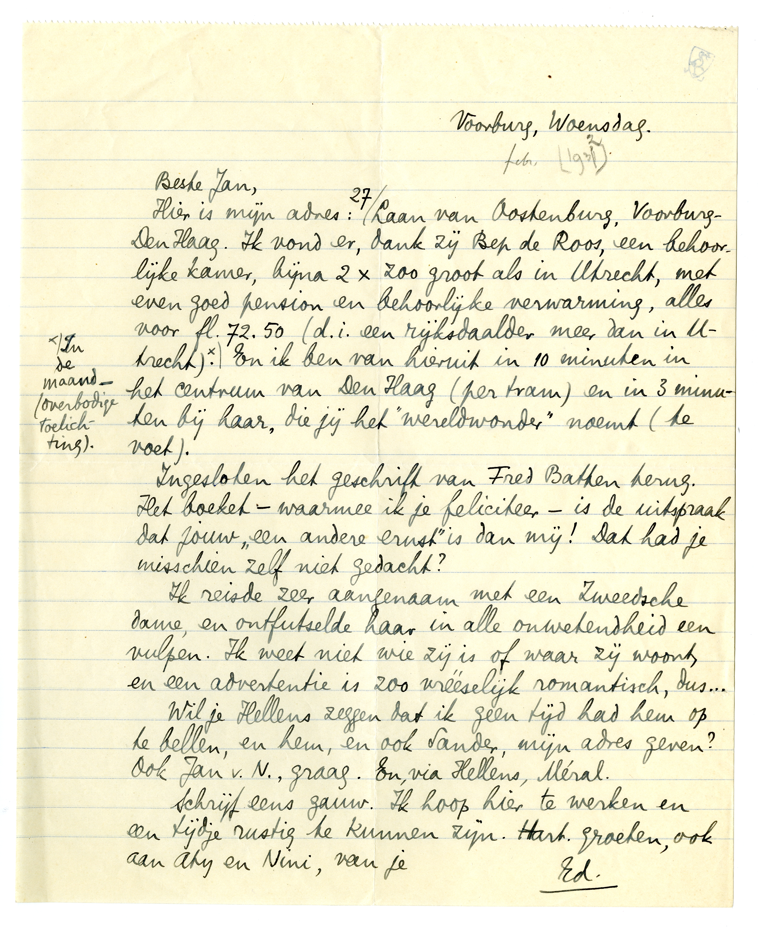 Hier is mijn adres: 27 Laan van Oostenburg, Voorburg-Den Haag. Ik vond er, dank zij Bep de Roos, een behoorlijke kamer, bijna 2 × zoo groot als in Utrecht, met even goed pension en behoorlijke verwarming, alles voor fl.72.50 (d.i. een rijksdaalder meer dan in Utrecht).* En ik ben van hieruit in 10 minuten in het centrum van Den Haag (per tram) en in 3 minuten bij haar, die jij het ‘wereldwonder’ noemt (te voet).