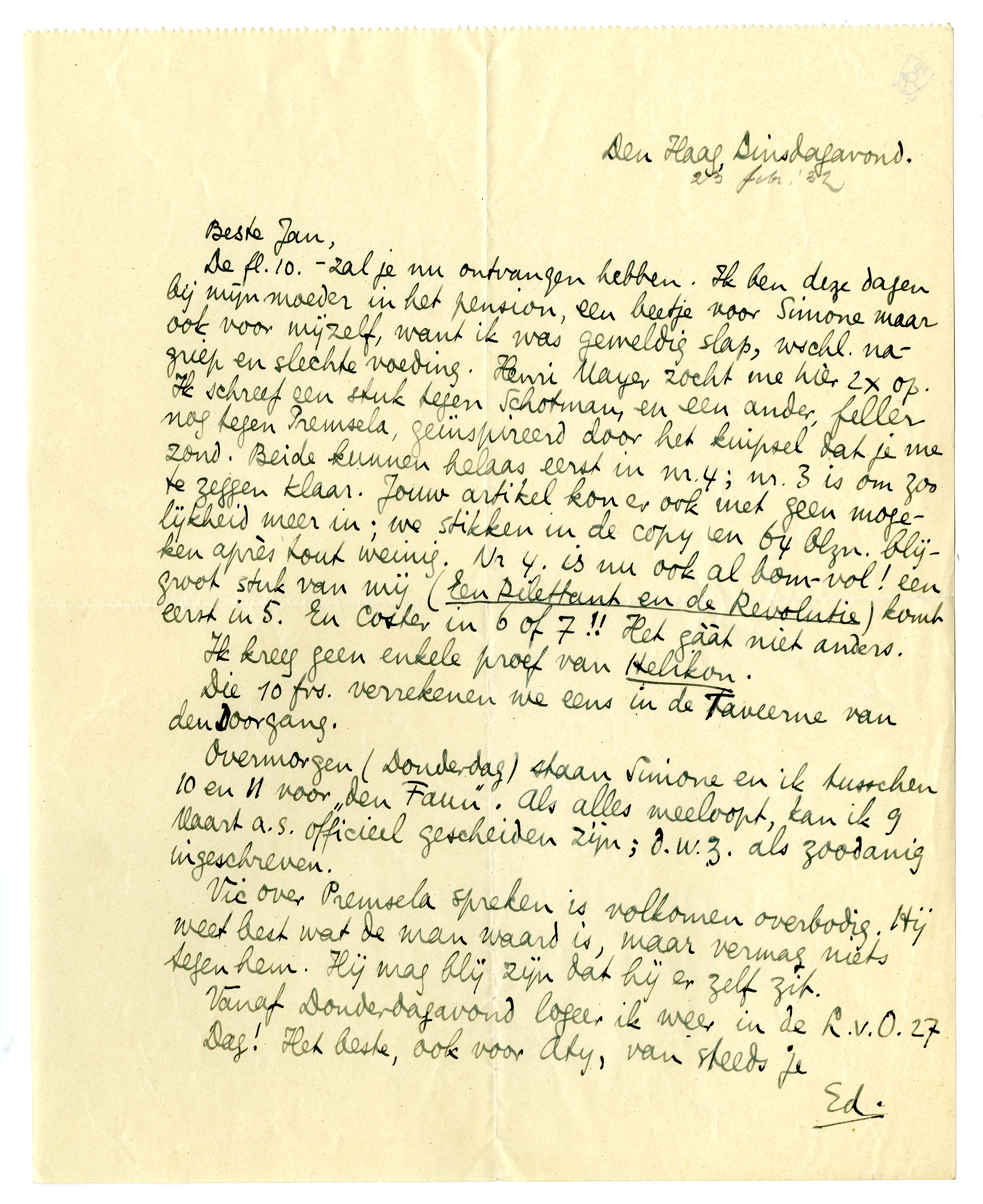 De fl.10 - zal je nu ontvangen hebben. Ik ben deze dagen bij mijn moeder in het pension, een beetje voor Simone maar ook voor mijzelf, want ik was geweldig slap, wschl. nagriep en slechte voeding. Henri Mayer zocht me hier 2 × op. Ik schreef een stuk tegen Schotman,2082 en een ander, feller nog tegen Premsela,2083 geïnspireerd door het knipsel dat je me zond. Beide kunnen helaas eerst in nr. 4; nr. 3 is om zoo te zeggen klaar. Jouw artikel2084 kon er ook met geen mogelijkheid meer in; we stikken in de copy en 64 blzn. blijken après tout weinig. Nr. 4 is nu ook al bom-vol! een groot stuk van mij (Een Dilettant en de Revolutie)2085 komt eerst in 5. En Coster in 6 of 7!!2086 Het gààt niet anders.