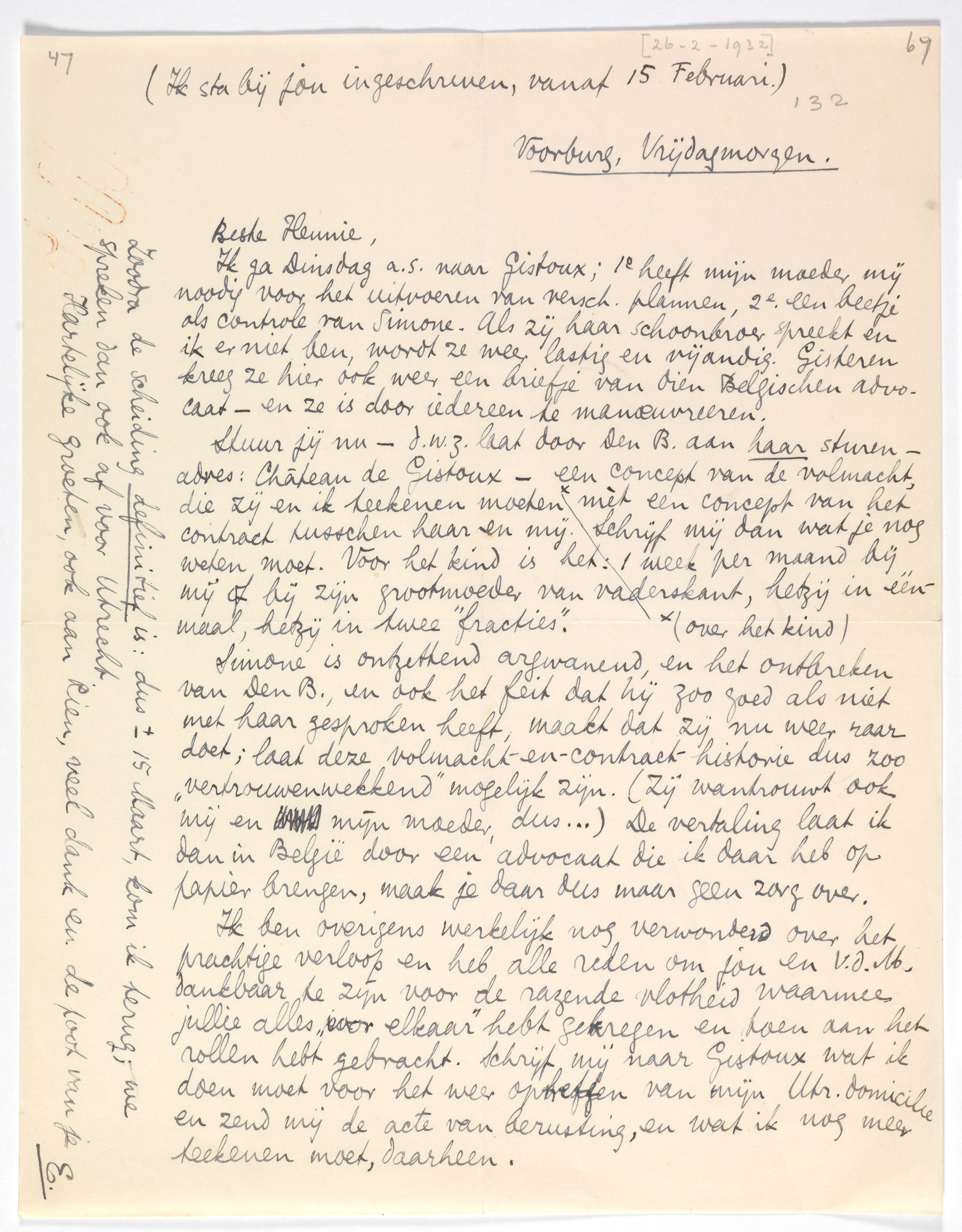 Simone is ontzettend argwanend, en het ontbreken van Den B., en ook het feit dat hij zoo goed als niet met haar gesproken heeft, maakt dat zij nu weer raar doet; laat deze volmacht-en-contract-historie dus zoo ‘vertrouwenwekkend’ mogelijk zijn. (Zij wantrouwt ook mij en mijn moeder, dus...) De vertaling laat ik dan in België door een advocaat die ik daar heb op papier brengen, maak je daar dus maar geen zorg over.