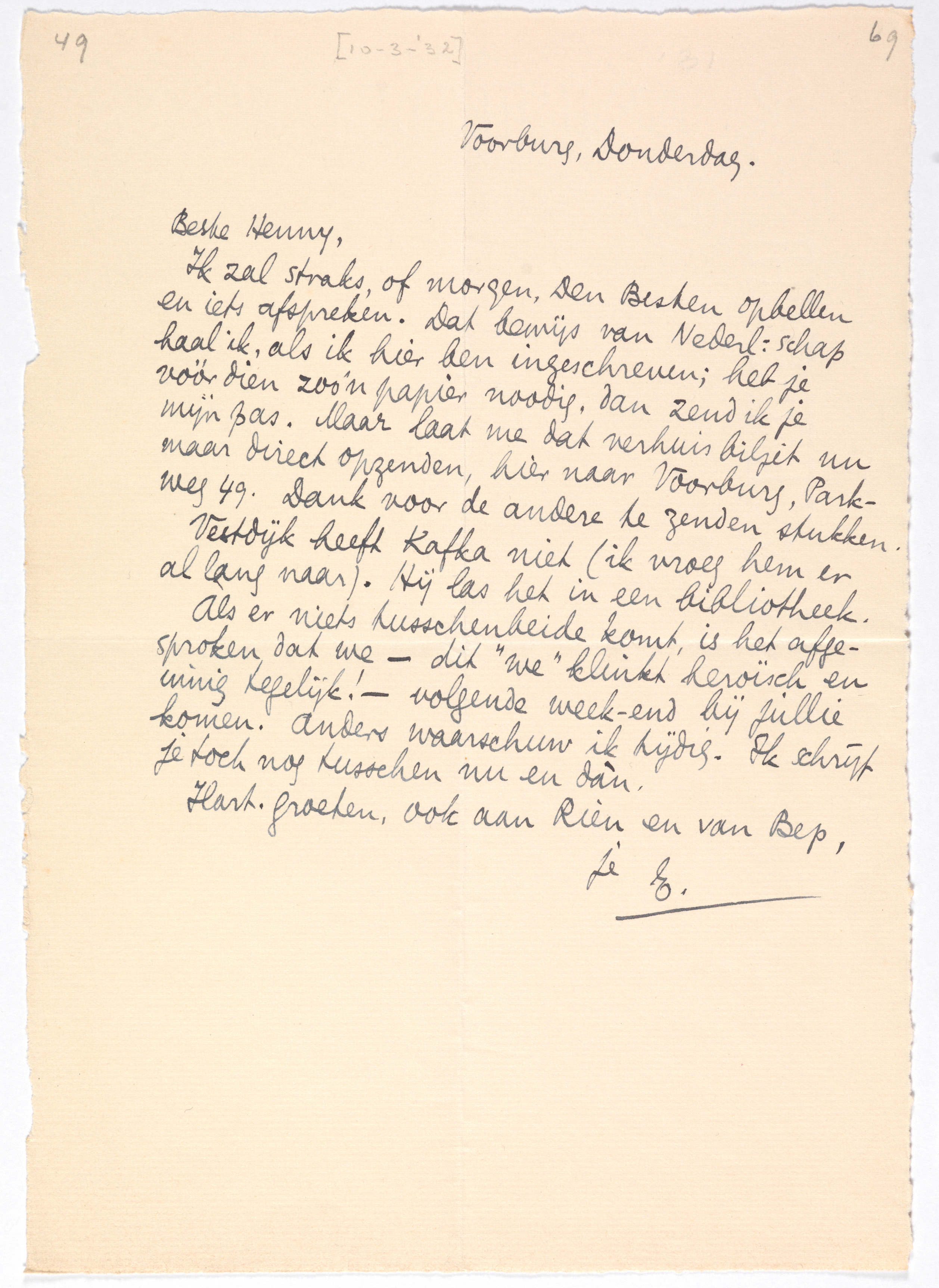 Ik zal straks, of morgen, Den Besten opbellen en iets afspreken. Dat bewijs van Nederl.-schap haal ik, als ik hier ben ingeschreven; heb je vóór dien zoo'n papier noodig, dan zend ik je mijn pas. Maar laat me dat verhuisbiljet nu maar direct opzenden, hier naar Voorburg, Parkweg 49. Dank voor de andere te zenden stukken.