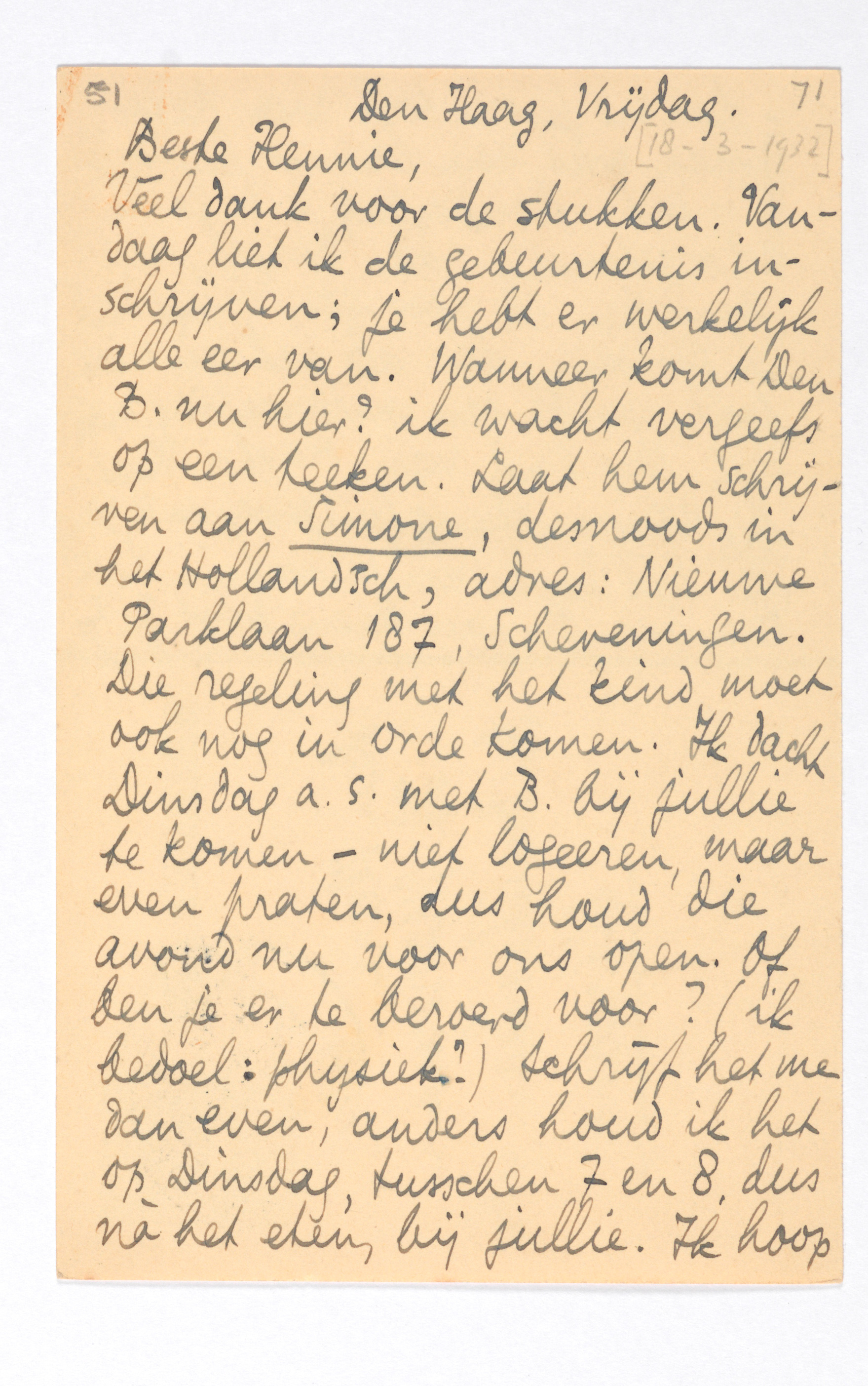 Veel dank voor de stukken. Vandaag liet ik de gebeurtenis inschrijven; je hebt er werkelijk alle eer van. Wanneer komt Den B. nu hier? ik wacht vergeefs op een teeken. Laat hem schrijven aan Simone, desnoods in het Hollandsch, adres: Nieuwe Parklaan 187, Scheveningen. Die regeling met het kind moet ook nog in orde komen. Ik dacht Dinsdag a.s. met B. bij jullie te komen - niet logeeren, maar even praten, dus houd die avond nu voor ons open. Of ben je er te beroerd voor? (ik bedoel: physiek?) Schrijf het me dan even, anders houd ik het op Dinsdag, tusschen 7 en 8, dus nà het eten, bij jullie. Ik hoop dat het je nu toch weer beter gaat, wat een lamme historie is dat. Donderdag a.s. ga ik hoogstwschl. naar Bergen, in April ben ik voor een groot deel in Gistoux, dus als het nù niet gaat, wordt een ontmoeting moeilijk. Het boek van Kafka heet: Die Verwandlung (uitgever na te zien). Nu, het beste en misschien tot Dinsdag. Gr. aan Rien; poot.