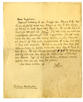 Daarnet ontvang ik een briefje van Menno t.B.,2111 dat hij nu eindelijk eerst van Bouws je vers te zien kreeg, en dat hij er après tout toch tegen is. Hij vindt het n.l. lang niet zoo goed als Vera J. (ik ook niet) en acht een mystificatie jouwerzijds niet uitgesloten (ik ook niet, maar het kan me zoo weinig schelen, in een branche als deze!) Ik blijf erbij, mystificatie of niet, het vers is lang niet onaardig. Ik heb er nu nog eens over geschreven, maar in laatste instantie kan het 2 tegen 1 zijn, dus... Ik heb Menno gevraagd je zelf te schrijven; doet hij dit niet, dan krijg je ‘definitief uitsluitsel’ van Bouws. Oef! ik heb me zelden zooveel moeite gegeven voor iets, als voor dit gedicht.