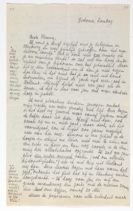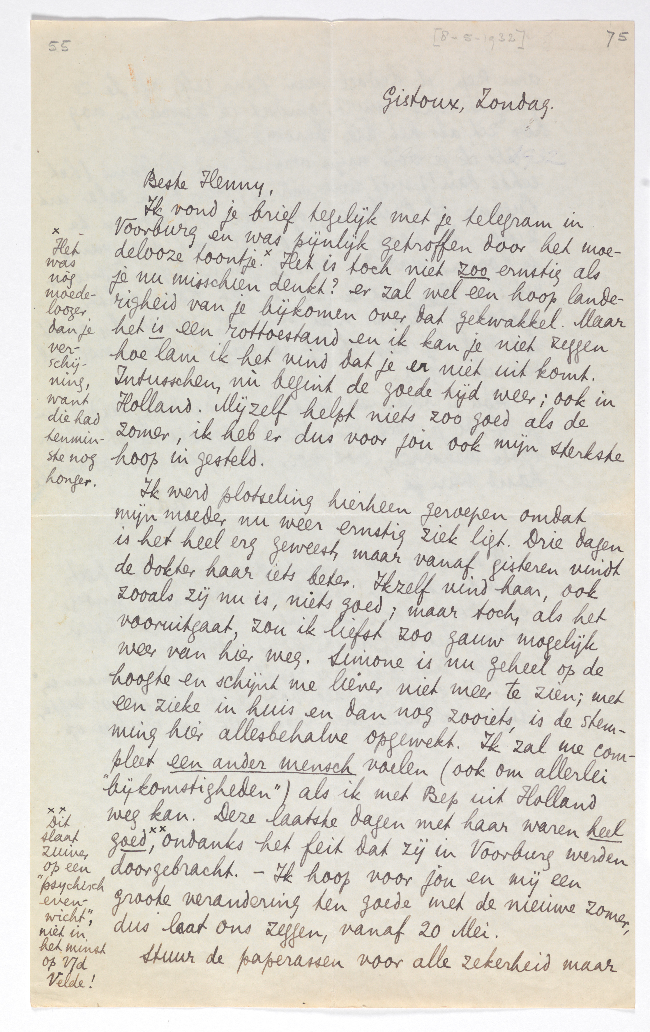 Ik werd plotseling hierheen geroepen omdat mijn moeder nu weer ernstig ziek ligt. Drie dagen is het heel erg geweest, maar vanaf gisteren vindt de dokter haar iets beter. Ikzelf vind haar, ook zooals zij nu is, niets goed; maar toch, als het vooruitgaat, zou ik liefst zoo gauw mogelijk weer van hier weg. Simone is nu geheel op de hoogte en schijnt me liever niet meer te zien; met een zieke in huis en dan nog zooiets, is de stemming hier allesbehalve opgewekt. Ik zal me compleet een ander mensch voelen (ook om allerlei ‘bijkomstigheden’) als ik met Bep uit Holland weg kan. Deze laatste dagen met haar waren heel goed,* ondanks het feit dat zij in Voorburg werden doorgebracht. - Ik hoop voor jou en mij een groote verandering ten goede met de nieuwe zomer, dus laat ons zeggen, vanaf 20 Mei.