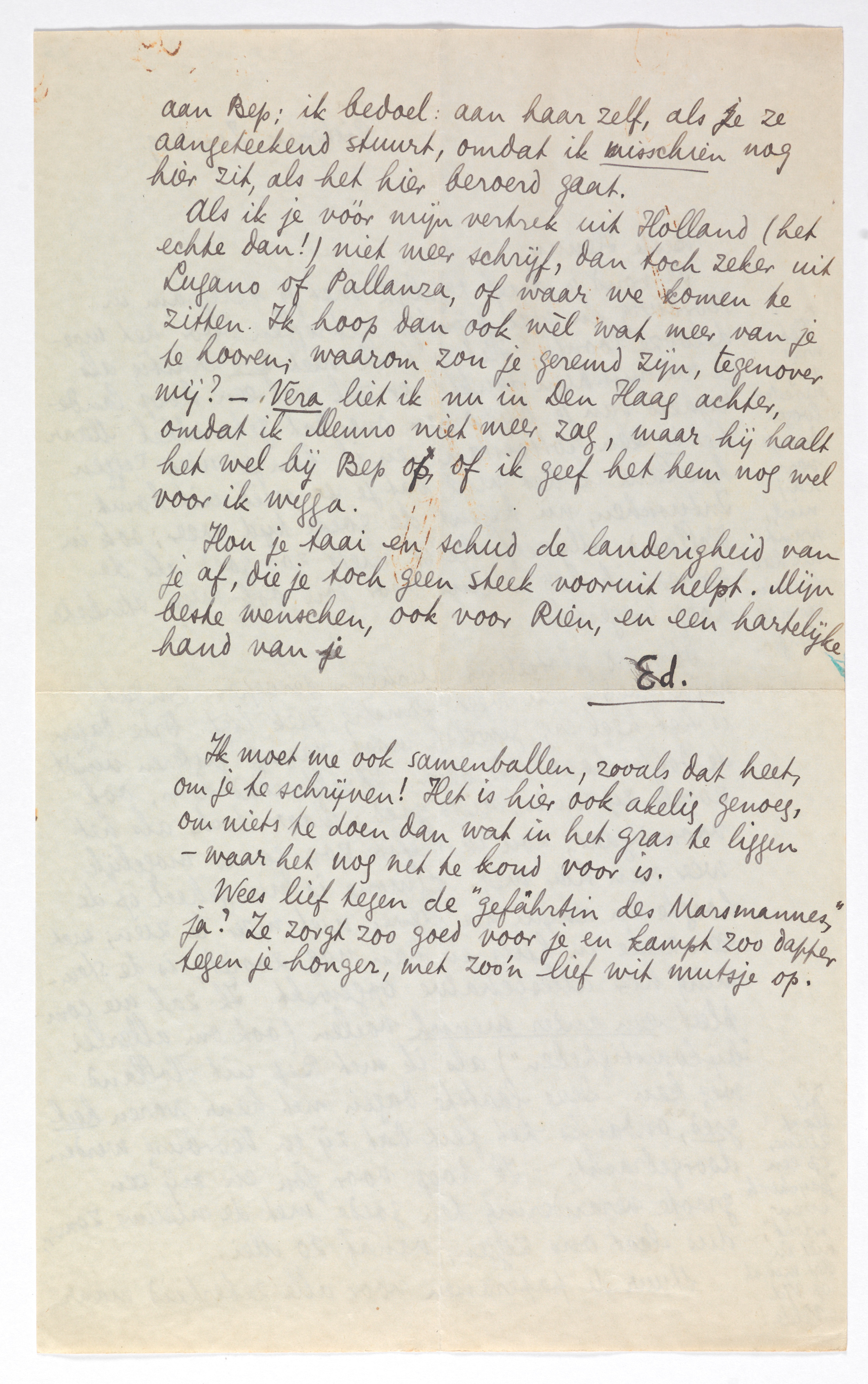 Als ik je vóór mijn vertrek uit Holland (het echte dan!) niet meer schrijf, dan toch zeker uit Lugano of Pallanza, of waar we komen te zitten. Ik hoop dan ook wèl wat meer van je te hooren; waarom zou je geremd zijn, tegenover mij? - Vera liet ik nu in Den Haag achter, omdat ik Menno niet meer zag, maar hij haalt het wel bij Bep op, of ik geef het hem nog wel voor ik wegga.
