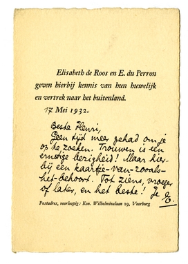 Geen tijd meer gehad om je op te zoeken. Trouwen is een ernstige bezigheid! Maar hierbij een kaartje-van-zooals-het-behoort. Tot ziens, vroeger of later, en het beste! Je