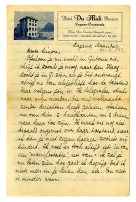 Ditzelfde geldt voor Simone. Het is voor mij een moeilijk geval; gegeven haar mentaliteit, die voor mijzelf dikwijls nog een puzzle is, weet ik gewoon niet of ik goed doe, of juist niet, met haar van hieruit te schrijven. Ik zou haar niet graag pijn doen, juist wanneer ik denk dat ik het tegengestelde bereik; praat jij eens met haar erover en schrijf me wat ik doen moet. Over jou en haar hoef je me niet te schrijven, als dat je onaangenaam is; ik ken nu je scrupules, maar neem één ding van me aan: dat je tegenover mij volkomen vrij bent èn dat ik het grootste vertrouwen in je heb. - Schrijf me daarentegen wèl wat je indrukken zijn van den toestand thuis, ook wat betreft de verhouding tusschen mijn moeder, Gille en Simone.
