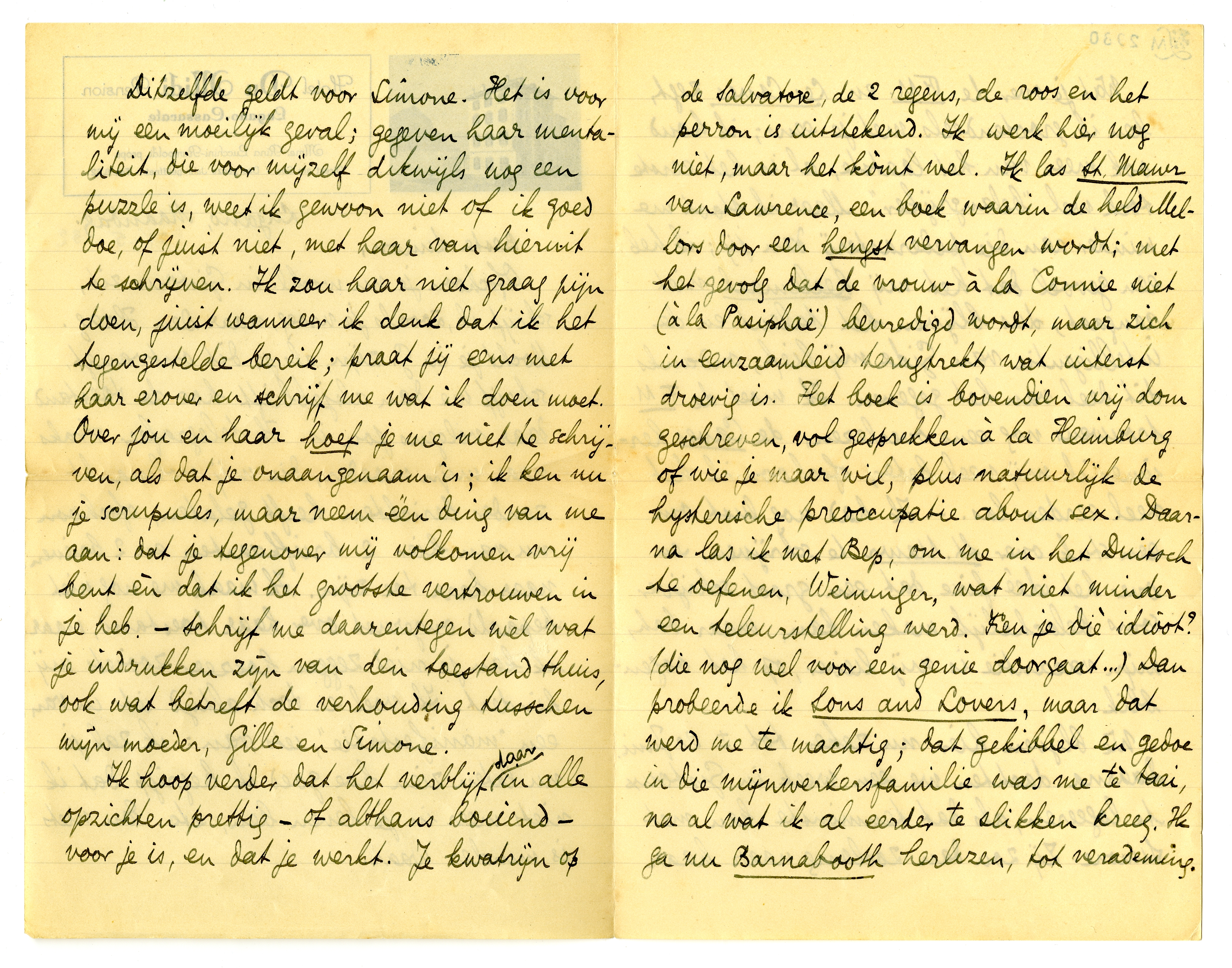 Ik hoop verder dat het verblijf daar in alle opzichten prettig - of althans boeiend - voor je is, en dat je werkt. Je kwatrijn op de Salvatore, de 2 regens, de roos en het perron2143 is uitstekend. Ik werk hier nog niet, maar het kòmt wel. Ik las St. Mawr van Lawrence, een boek waarin de held Mellors door een hengst vervangen wordt; met het gevolg dat de vrouw à la Connie niet (à la Pasiphaë) bevredigd wordt, maar zich in eenzaamheid terugtrekt, wat uiterst droevig is. Het boek is bovendien vrij dom geschreven, vol gesprekken à la Heimburg2144 of wie je maar wil, plus natuurlijk de hysterische preoccupatie about sex. Daarna las ik met Bep, om me in het Duitsch te oefenen, Weininger,2145 wat niet minder een teleurstelling werd. Ken je diè idioot? (die nog wel voor een genie doorgaat...) Dan probeerde ik Sons and Lopers, maar dat werd me te machtig; dat gekibbel en gedoe in die mijnwerkersfamilie was me tè taai, na al wat ik al eerder te slikken kreeg. Ik ga nu Barnabooth herlezen, tot verademing.