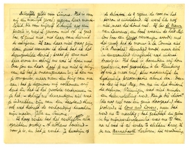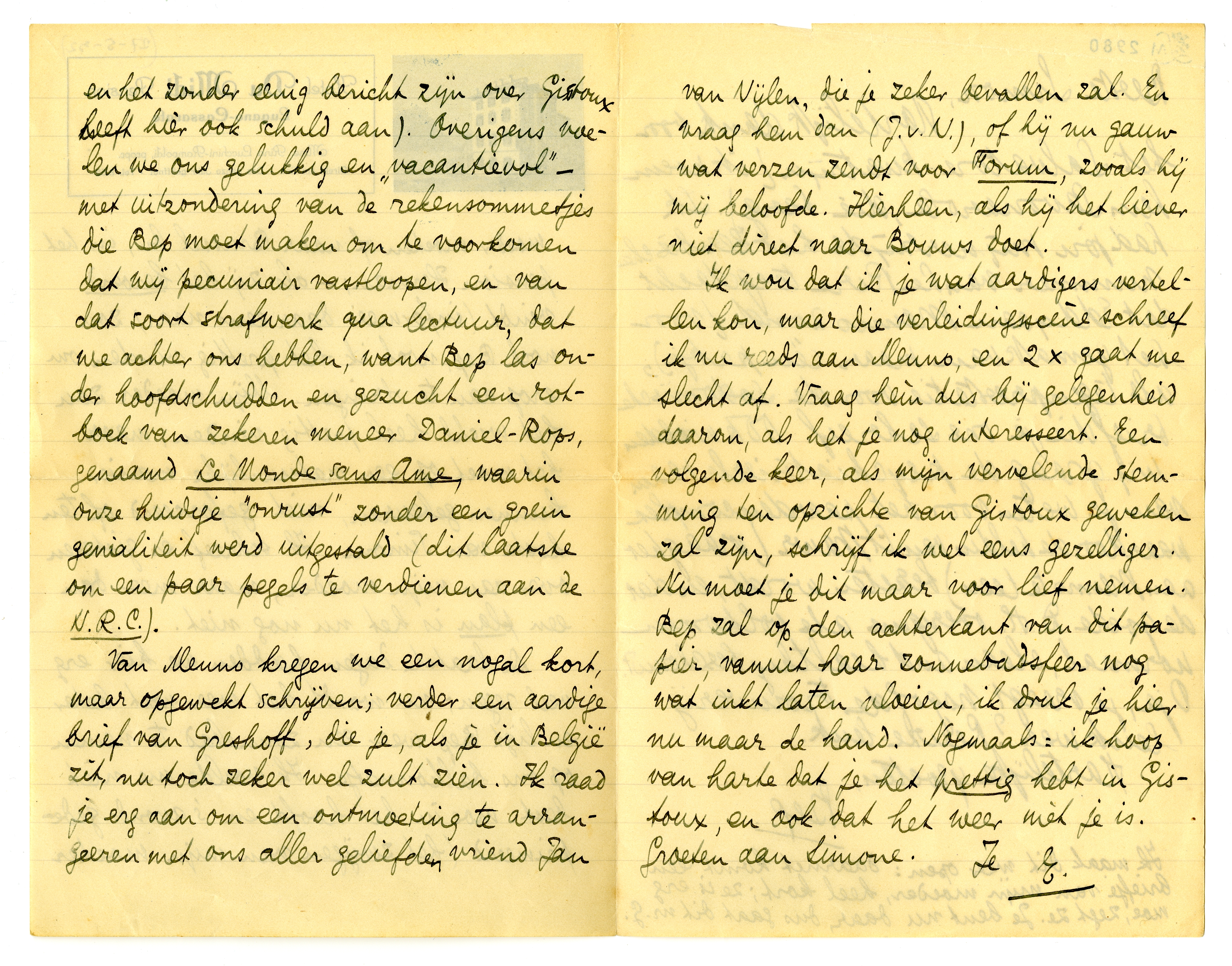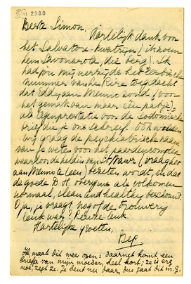 Ik wou dat ik je wat aardigers vertellen kon, maar die verleidingsscène schreef ik nu reeds aan Menno,2149 en 2 × gaat me slecht af. Vraag hèm dus bij gelegenheid daarom, als het je nog interesseert. Een volgende keer, als mijn vervelende stemming ten opzichte van Gistoux geweken zal zijn, schrijf ik wel eens gezelliger. Nu moet je dit maar voor lief nemen. Bep zal op den achterkant van dit papier, vanuit haar zonnebadsfeer nog wat inkt laten vloeien, ik druk je hier nu maar de hand. Nogmaals: ik hoop van harte dat je het prettig hebt in Gistoux, en ook dat het weer mèt je is. Groeten aan Simone.