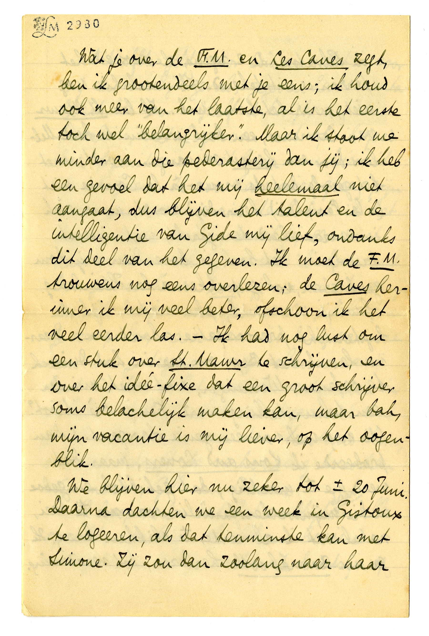 Wat je over de F.M. en Les Caves2146 zegt, ben ik grootendeels met je eens; ik houd ook meer van het laatste, al is het eerste toch wel ‘belangrijker’. Maar ik stoot me minder aan die pederasterij dan jij; ik heb een gevoel dat het mij heelemaal niet aangaat, dus blijven het talent en de intelligentie van Gide mij lief, ondanks dit deel van het gegeven. Ik moet de F.M. trouwens nog eens overlezen; de Caves herinner ik mij veel beter, ofschoon ik het veel eerder las. - Ik had nog lust om een stuk over St. Mawr te schrijven, en over het idéefixe dat een groot schrijver soms belachelijk maken kan, maar bah, mijn vacantie is mij liever, op het oogenblik.