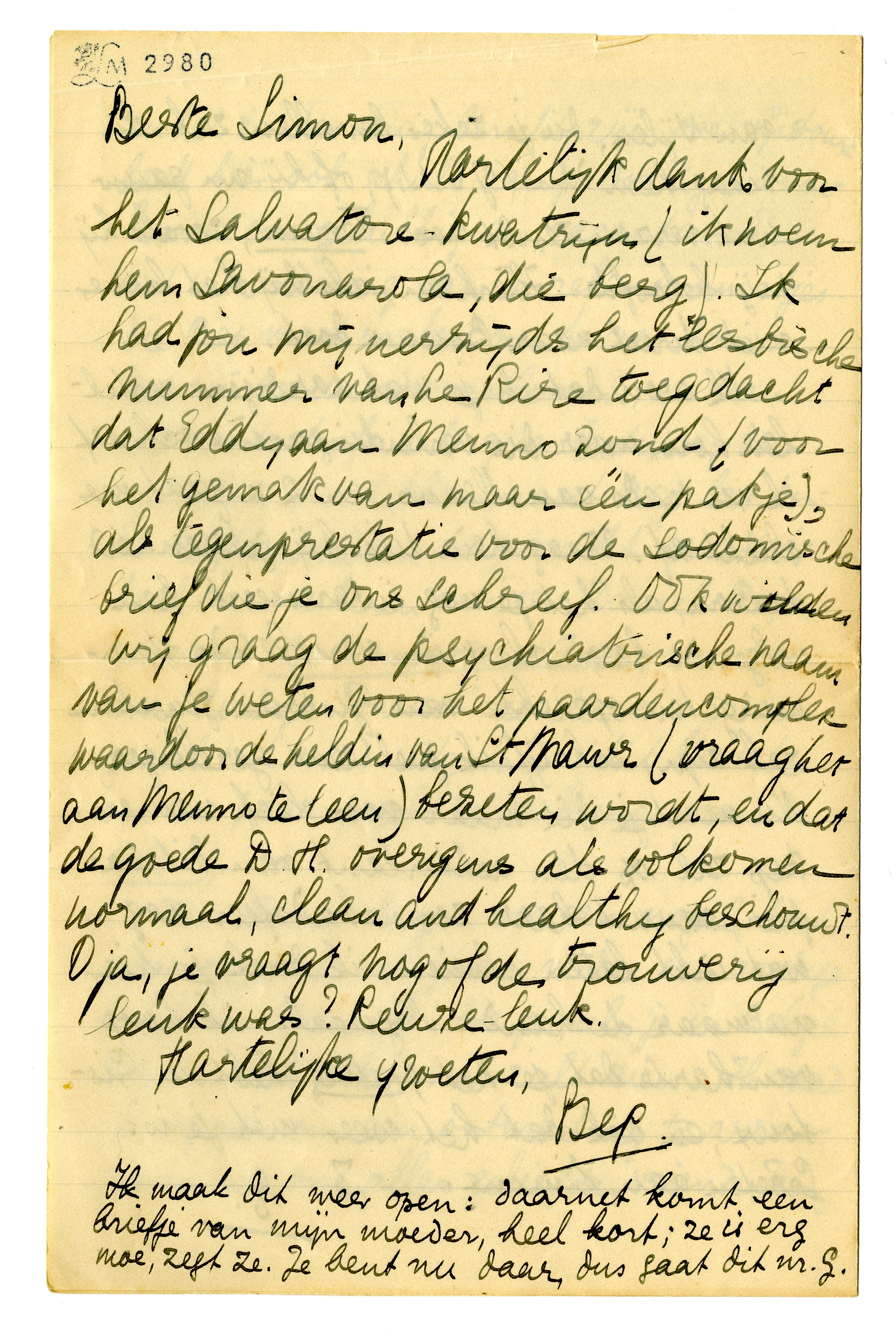 Hartelijk dank voor het Salvatore-kwatrijn (ik noem hem Savonarola, die berg). Ik had jou mijnerzijds het lesbische nummer van Le Rire toegedacht dat Eddy aan Menno zond (voor het gemak van maar één pakje), als tegenprestatie voor de sodomische brief die je ons schreef. Ook wilden wij graag de psychiatrische naam van je weten voor het paardencomplex waardoor de heldin van St Mawr (vraag het aan Menno te leen) bezeten wordt, en dat de goede D.H. overigens als volkomen normaal, clean and healthy beschouwt. O ja, je vraagt nog of de trouwerij leuk was? Reuze-leuk.