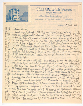Dank voor je briefje. Hèb ik je niet geschreven, of was het alleen maar een briefkaart? Hoe gaat het nu met je depressie? Wij hebben het hier opperbest, al valt het weer niet mee; het hotel is niet erg duur (nu we ons voor een maand verbonden hebben, maar 7 frs. = iets minder dan fl. 3.50 per persoon en per dag), en ons balkonnetje hangt om zoo te zeggen boven het water. Soms gaan we naar de bioscoop, als de economie het ons toestaat. We denken ± 20Juni van hier weg te gaan, waarheen is nog niet heelemaal zeker, en hangt trouwens ook van de economie af.