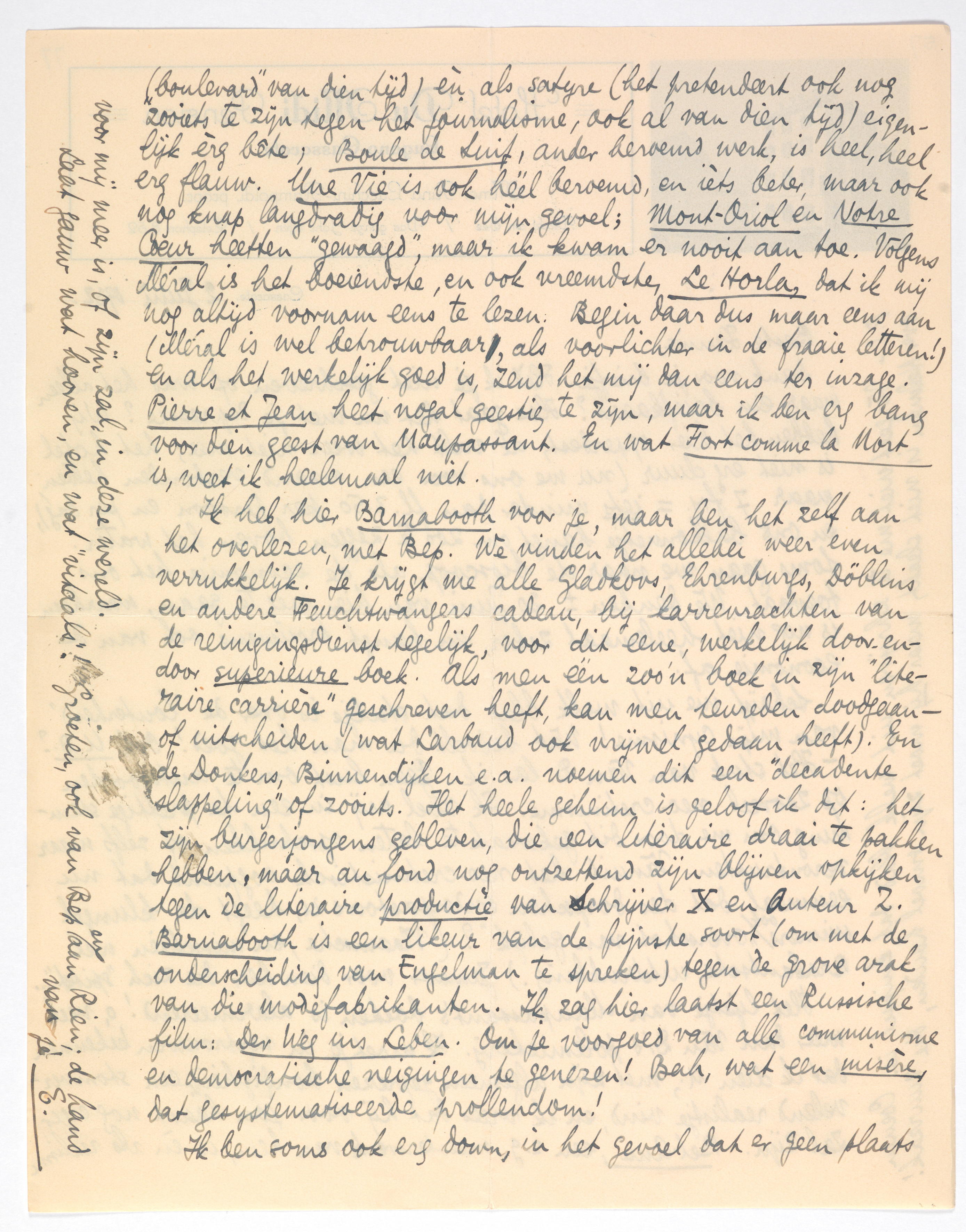 Het lijstje van Maupassant's boeken is alarmeerend! o, veel meer dan Van D.'s polemiekerij. Ik moet je in vertrouwen bekennen dat ik dien M., met zijn algemeen geprezen bondigheid, een stomvervelend realistje vind, en ik vrees dat hij voor jou haast nog erger zal zijn. Bel-Ami, een z.g. meesterwerk van hem, is èn als realisme (‘boulevard’ van dien tijd) èn als satyre (het pretendeert ook nog zooiets te zijn tegen het journalisme, ook al van dien tijd) eigenlijk èrg bête; Boule de Suif, ander beroemd werk, is heel, heel erg flauw. Une Vie is ook héél beroemd, en iéts beter, maar ook nog knap langdradig voor mijn gevoel; Mont-Oriol en Notre Coeur heetten ‘gewaagd’, maar ik kwam er nooit aan toe. Volgens Méral is het boeiendste, en ook vreemdste, Le Horla, dat ik mij nog altijd voornam eens te lezen. Begin daar dus maar eens aan (Méral is wel betrouwbaar, als voorlichter in de fraaie letteren!) en als het werkelijk goed is, zend het mij dan eens ter inzage. Pierre et Jean heet nogal geestig te zijn, maar ik ben erg bang voor dien geest van Maupassant. En wat Fort comme la Mort is, weet ik heelemaal niet.