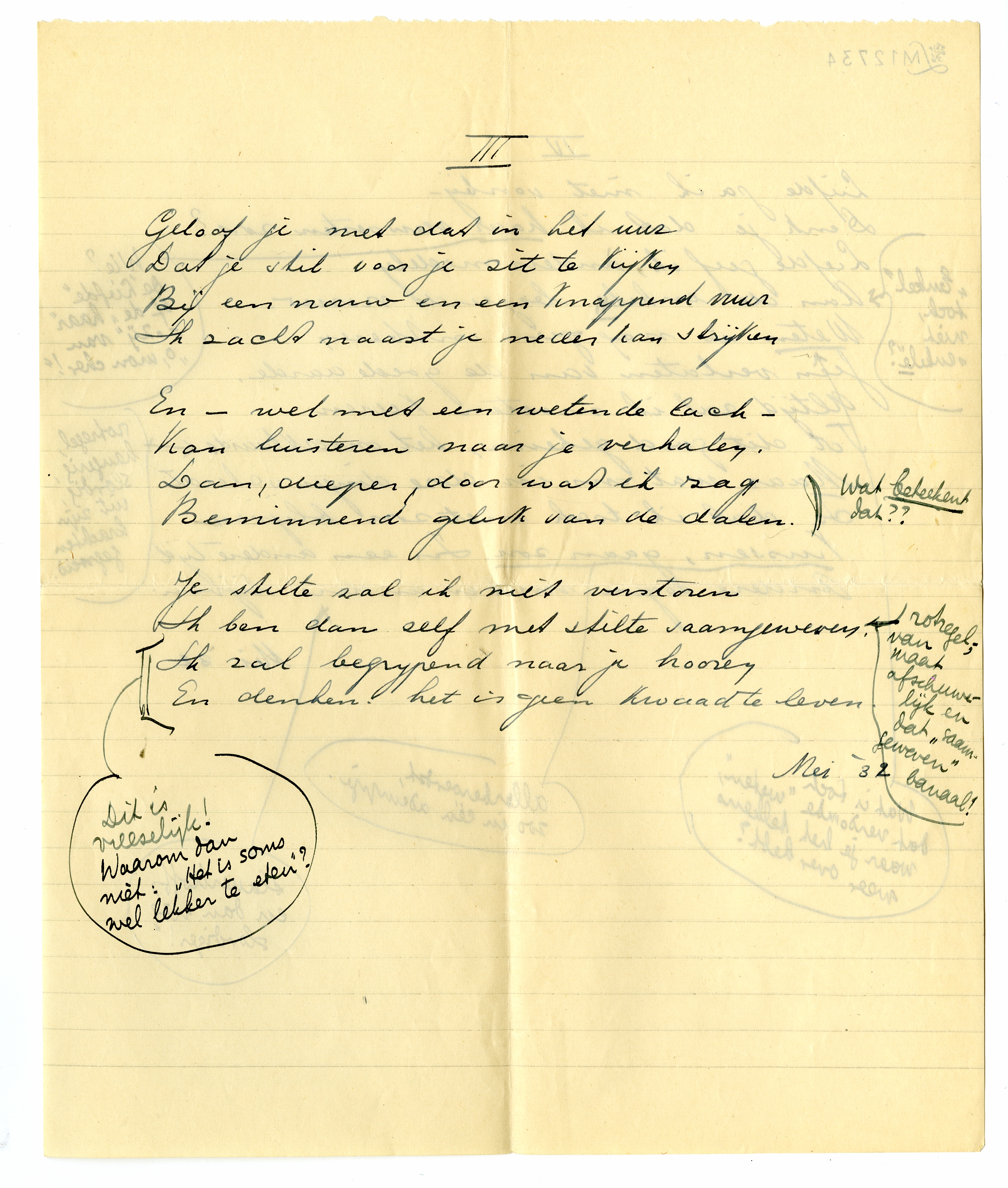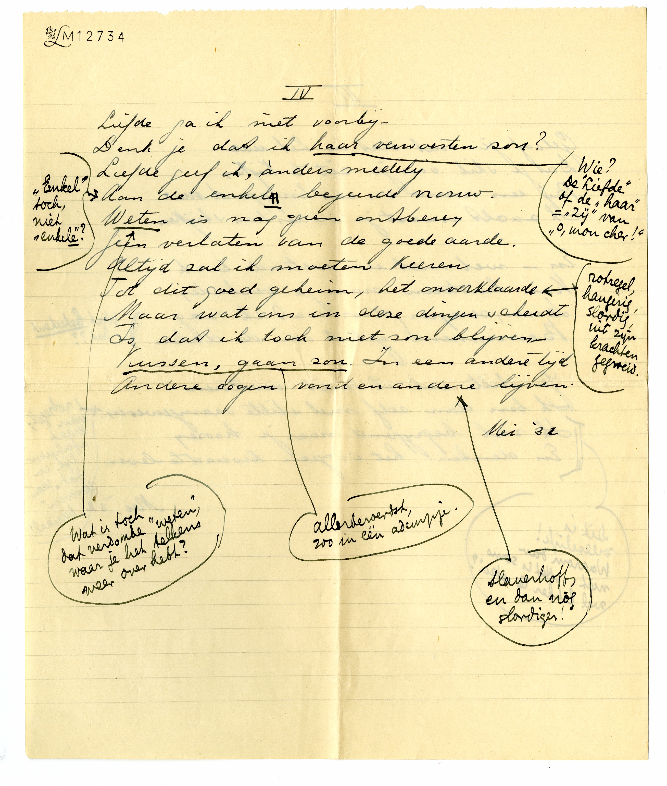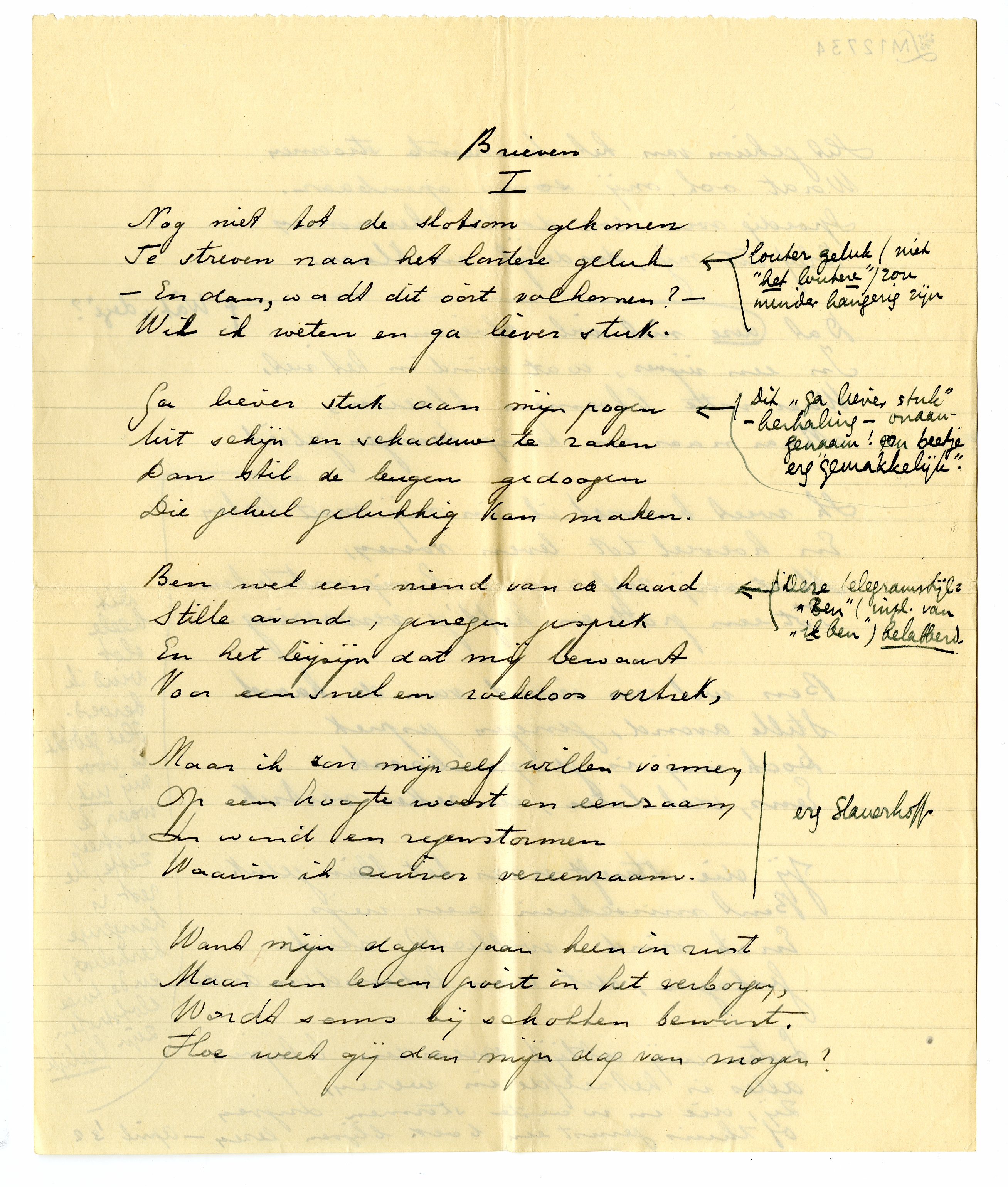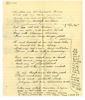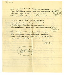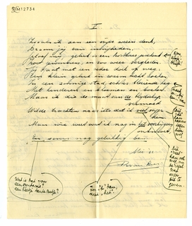 Kan je tegen precieze kritiek? Ik bedoel: onomwonden qua terminologie? Hierbij je verzen terug, waarin altijd (op De Zieke na, dat ik heelemaal een kreng vind) wel iets aardigs zit, vooral van toon; maar waarvan niet één mij werkelijk bevalt. Ik stuur je alles terug met kantteekeningen2168; ik vind dit werkje allerbelabberdst en had er veel liever eens met je over gesproken, maar wanneer zullen we elkaar terugzien? Het kan zijn dat ik me hier en daar vergis, en als je je ‘gangmaker’ Freddy consulteert, zal hij zeker niet nalaten je enthousiast te verzekeren dat ik er niets van begrepen heb, dat je rhythme voortreffelijk is, enz., maar enfin, ik kan je alleen mijn reacties openbaren. Trek je er niets van aan en schrijf andere verzen, en stuur me die ook weer.