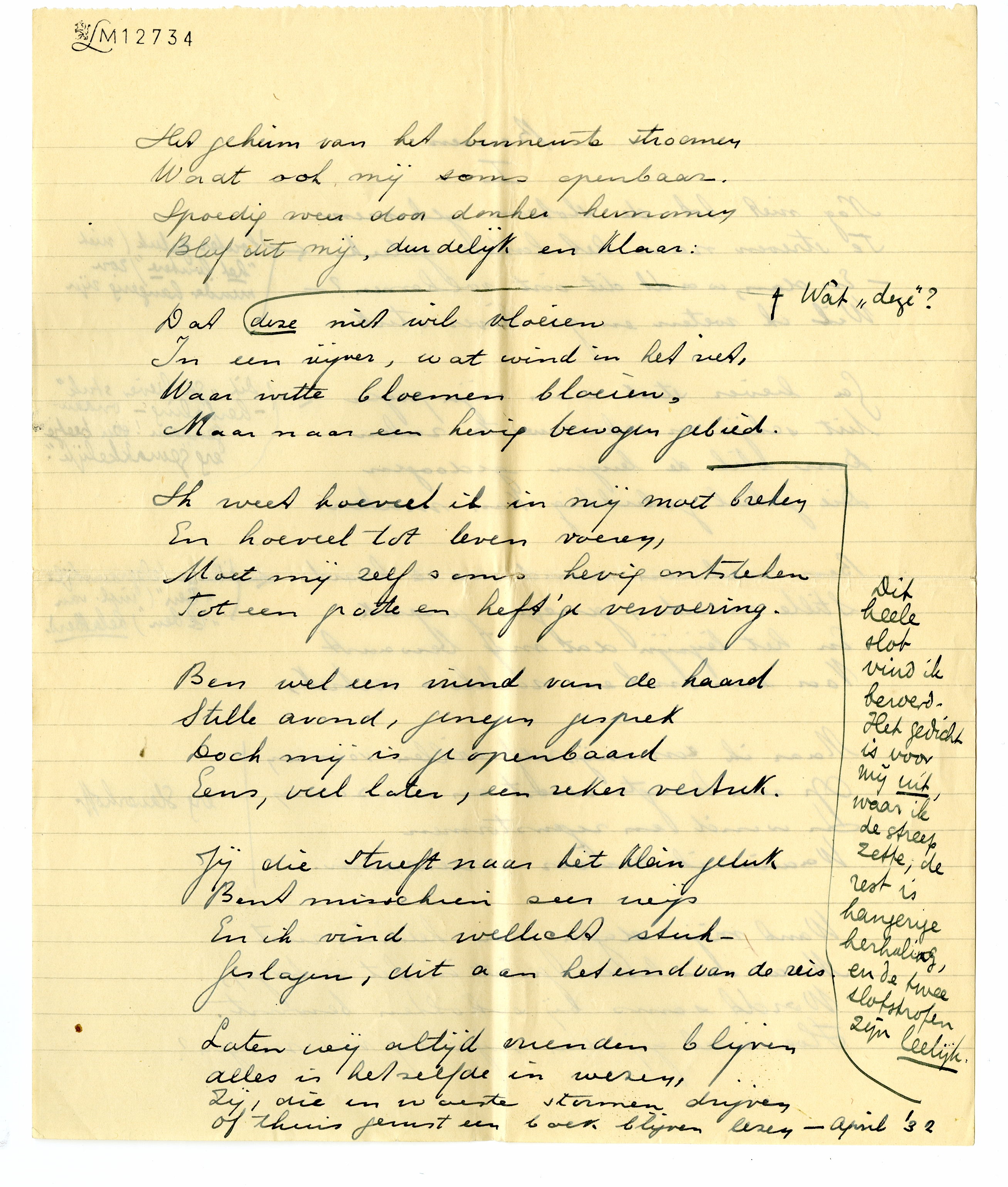 Dit heele slot vind ik beroerd. Het gedicht is voor mij uit, waar ik de streep2170 zette; de rest is hangerige herhaling, en de twee slotstrofen zijn leelijk.