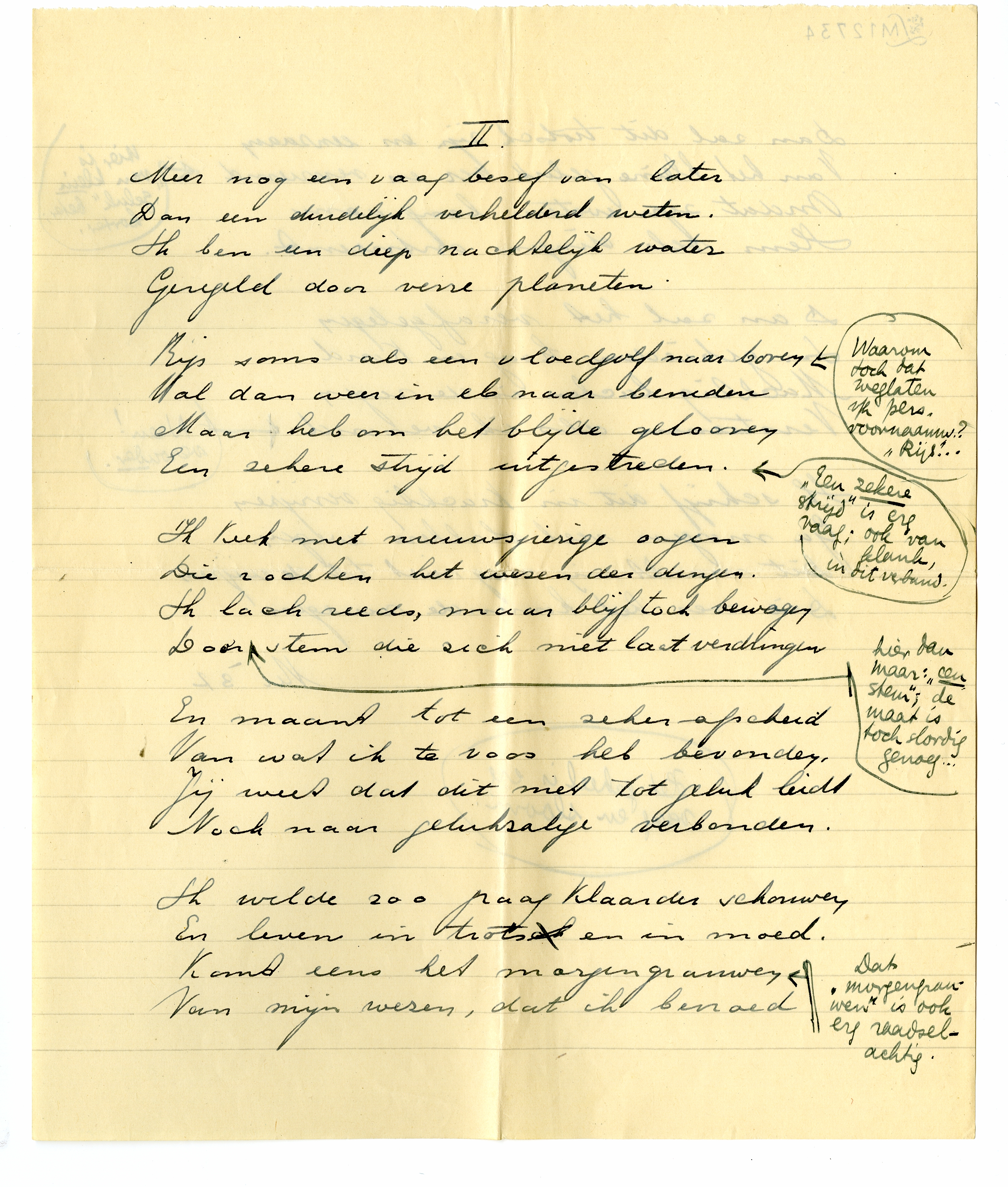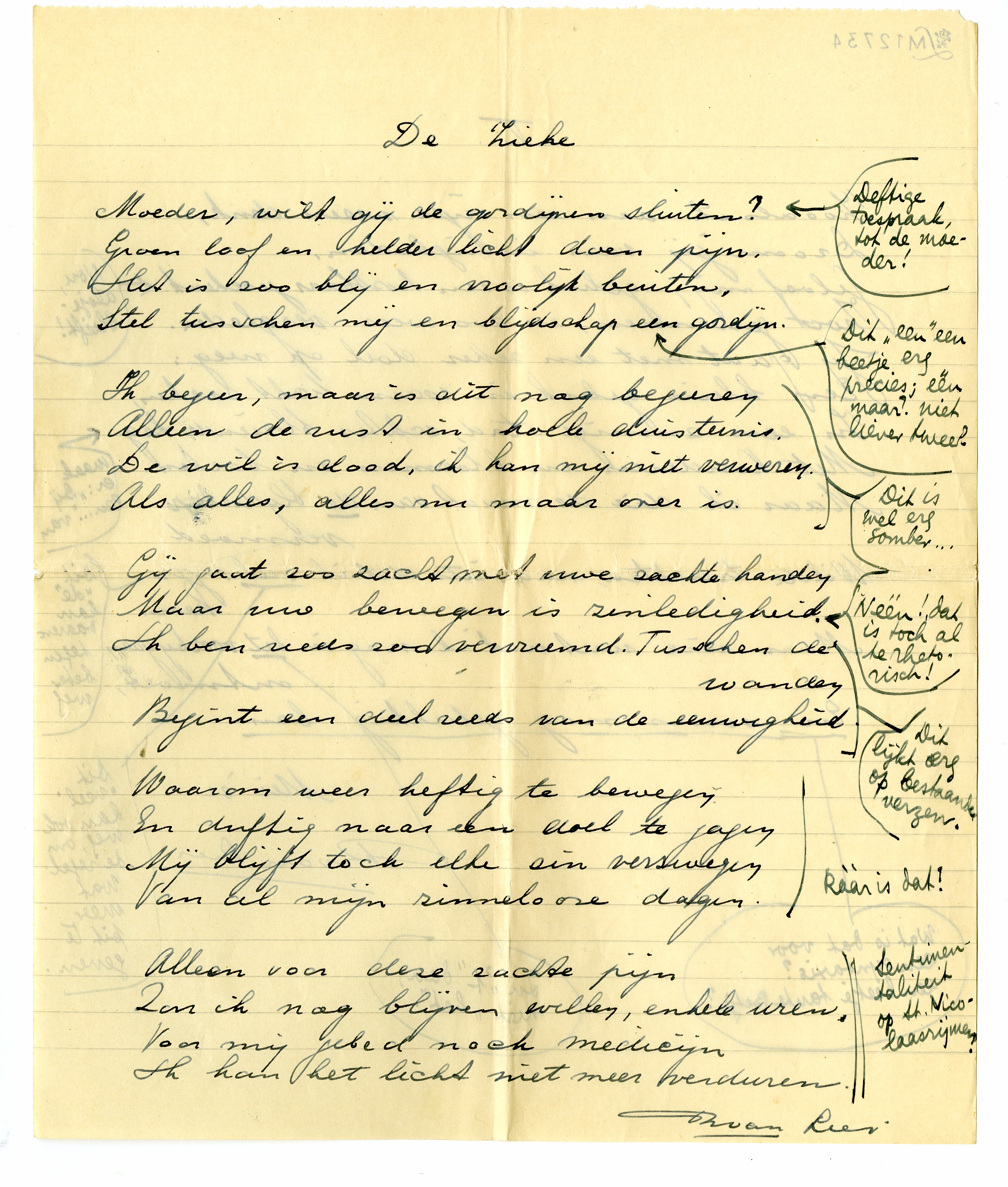 2168DP's kantlijnaantekeningen zijn hier afgedrukt tussen de strofen of verzen van Van Liers (cursief afgedrukte) gedichten, met asterisken i.p.v. strepen en pijlen.