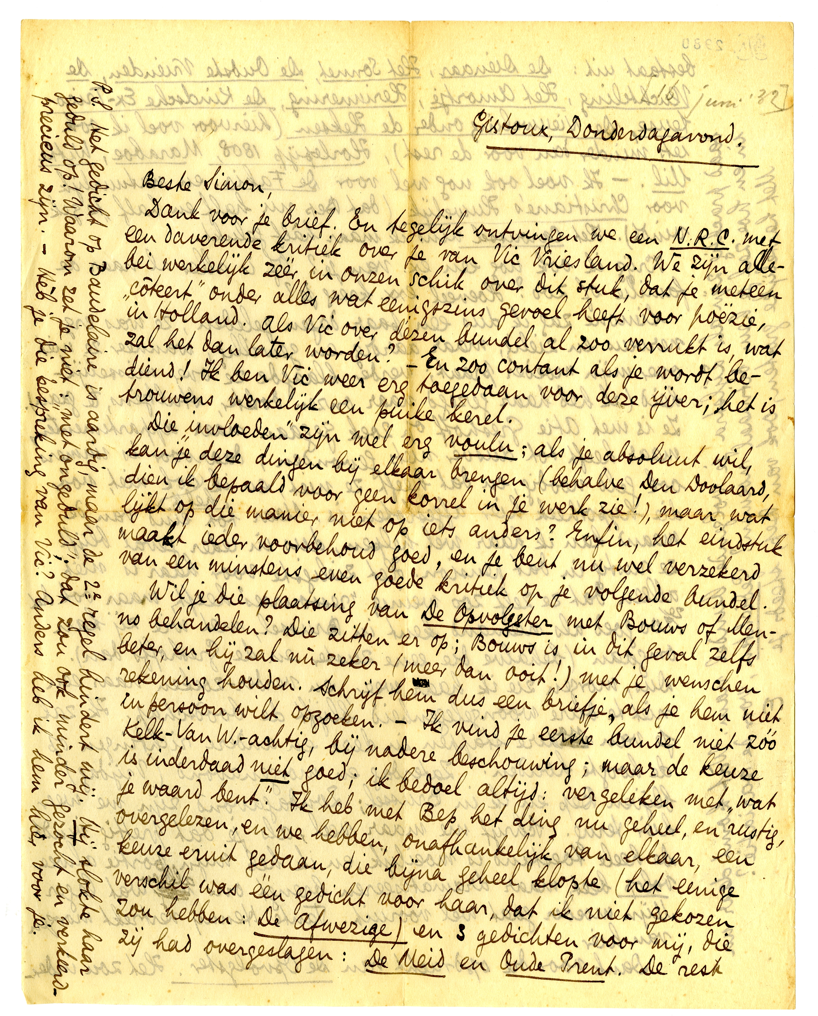 Dank voor je brief. En tegelijk ontvingen we een N.R.C. met een daverende kritiek over je van Vic Vriesland.2192 We zijn allebei werkelijk zéér in onzen schik over dit stuk, dat je meteen ‘côteert’ onder alles wat eenigszins gevoel heeft voor poëzie, in Holland. Als Vic over dézen bundel al zoo verrukt is, wat zal het dan later worden? - En zoo contant als je wordt bediend! Ik ben Vic weer erg toegedaan voor deze ijver; het is trouwens werkelijk een puike kerel.