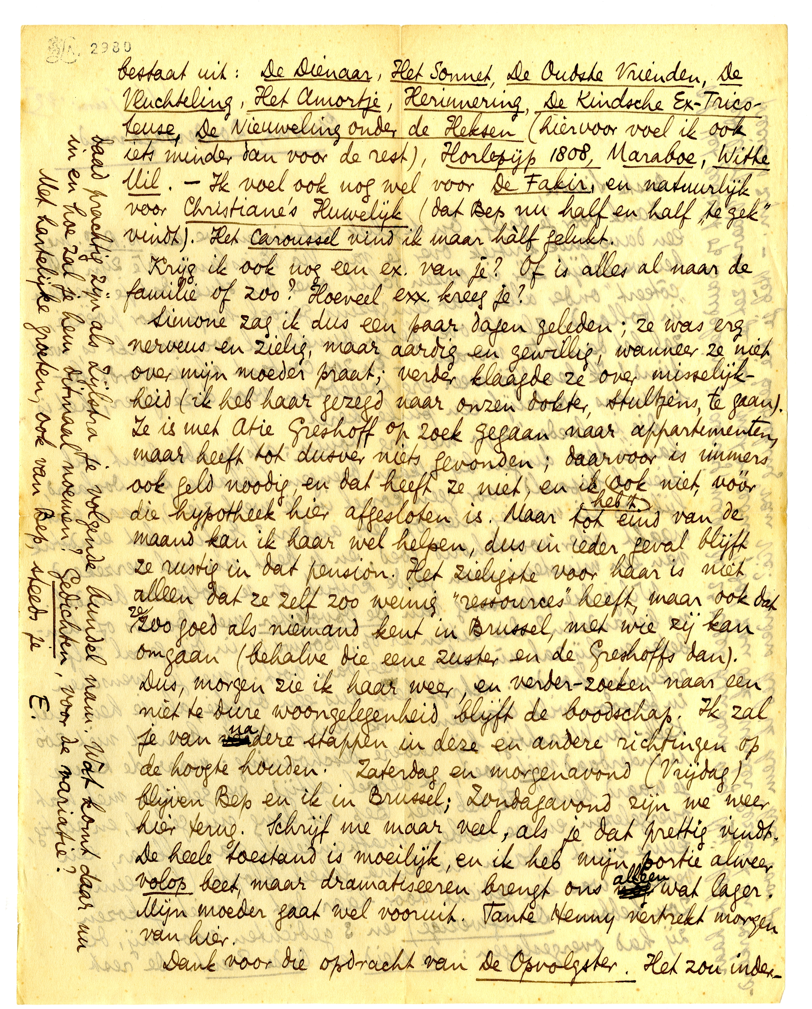 Simone zag ik dus een paar dagen geleden; ze was erg nerveus en zielig, maar aardig en gewillig, wanneer ze niet over mijn moeder praat; verder klaagde ze over misselijkheid (ik heb haar gezegd naar onzen dokter, Stultjens, te gaan). Ze is met Atie Greshoff op zoek gegaan naar appartementen, maar heeft tot dusver niets gevonden; daarvoor is immers ook geld noodig, en dat heeft ze niet, en ik heb 't ook niet, vóór die hypotheek hier afgesloten is. Maar tot eind van de maand kan ik haar wel helpen, dus in ieder geval blijft ze rustig in dat pension. Het zieligste voor haar is niet alleen dat ze zelf zoo weinig ‘ressources’ heeft, maar ook dat ze zoo goed als niemand kent in Brussel, met wie zij kan omgaan (behalve die eene zuster en de Greshoffs dan). Dus, morgen zie ik haar weer, en verder-zoeken naar een niet te dure woongelegenheid blijft de boodschap. Ik zal je van nadere stappen in deze en andere richtingen op de hoogte houden. Zaterdag en morgenavond (Vrijdag) blijven Bep en ik in Brussel; Zondagavond zijn we weer hier terug. Schrijf me maar veel, als je dat prettig vindt. De heele toestand is moeilijk, en ik heb mijn portie alweer volop beet, maar dramatiseeren brengt ons alleen wat lager. Mijn moeder gaat wel vooruit. Tante Henny vertrekt morgen van hier.