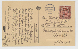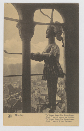 2198Prentbriefkaart: beeldje van Jan van Nijvel in de klokketoren van Nijvel.