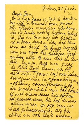 Er is weer kans op dat ik Donderdag niet in Brussel kom, omdat dan allerlei menschen hier komen die de auto noodig hebben, geloof ik. Als we dus nog iets hebben af te doen samen, doe het dan even per brief. Je krijgt nog geld van me voor die kiekjes. Geef anders alles op aan Atie en Angèle. En o ja, Bep wou graag Le Petit Ami lezen; en jij hebt mijn (jouw ex-) exemplaar teruggenomen, in afwachting van, - of liever vooruitloopend op, die pracht-editie van dat comité met vicomtesse Zus-of-Zoo tot secretaresse, die tot dusver alleen maar 40 pop van me heeft geëncaisseerd. Als die editie nu ook blijft steken, vanwege de crisis, dan krijg ik mijn ex. toch van je terug? In ieder geval nu wel graag even te leen; dus geef dat dan ook aan Angèle of Atie. Is Simone nog gekomen en heeft ze wat gevonden? Het beste met de reis naar Holland, veel liefs van ons beiden, ook voor Atie, en tot spoedig.
