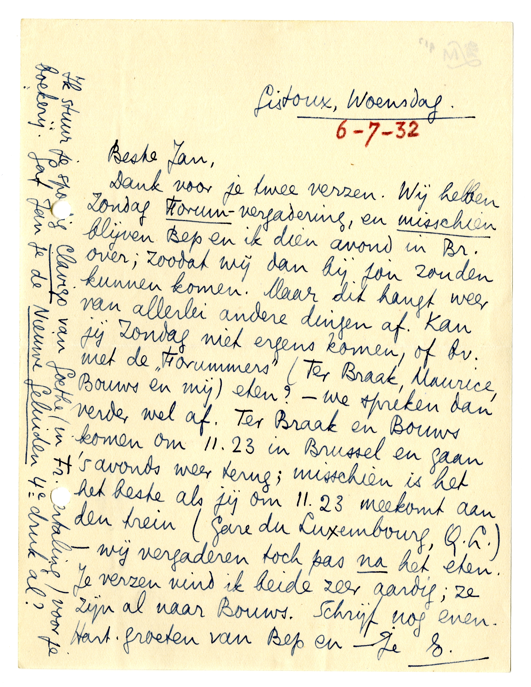 Dank voor je twee verzen.2220 Wij hebben Zondag Forum-vergade-ring, en misschien blijven Bep en ik dien avond in Br. over; zoodat wij dan bij jou zouden kunnen komen. Maar dit hangt weer van allerlei andere dingen af. Kan jij Zondag niet ergens komen, of bv. met de ‘Forummers’ (Ter Braak, Maurice, Bouws en mij) eten? - we spreken dan verder wel af. Ter Braak en Bouws komen om 11.23 in Brussel en gaan 's avonds weer terug; misschien is het het beste als jij om 11.23 meekomt aan den trein (Gare du Luxembourg, Q.L.) - wij vergaderen toch pas na het eten. Je verzen vind ik beide zeer aardig; ze zijn al naar Bouws. Schrijf nog even. Hart. groeten van Bep en - je