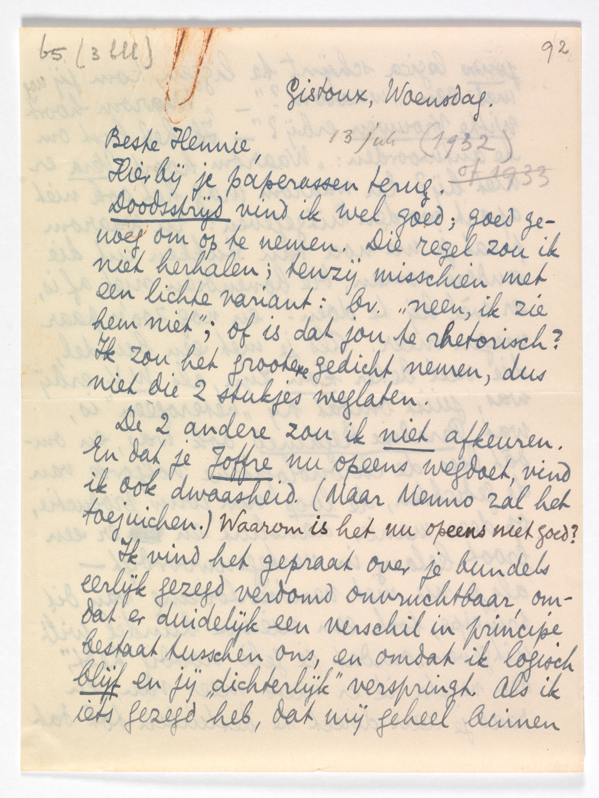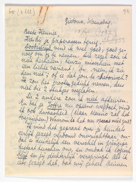 Je nieuwe verhalenbundel kan ik zoo op het papier niet ‘zien’. Ik ken die fragmenten niet, en eig. bijna niets van dit alles; dus?... - Wat nu je Dichten over den Dood2237 betreft, het begin vind ik de verwardste rotrommel die ik sinds tijden las; het slot daarentegen goed, - al ben ik het half en half met Rien eens dat je misschien beter deed, je vijanden niet met déze bekentenissen te plezieren door uitgave ervan. In Holland wordt zooiets met de noodige ‘eeuwigheidstermen’ natuurlijk in alle bladen geciteerd; en dan met van die commentaren, waar de dichterlijke geesten bij ons ook zoo gul mee zijn! Ik moet er niet aan denken. In ieder geval: blz. 1-3 is voor mij belabberd - en je zult met recht hiermee eerst eenige menschen, ‘die men niet bij het gepeupel dorst stellen’, doen grijnzen! - terwijl ik blz. 4 en 5 met spanning las. (Bep is geheel van ditzelfde gevoelen.)