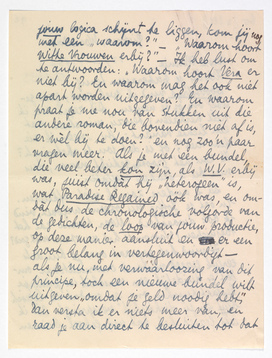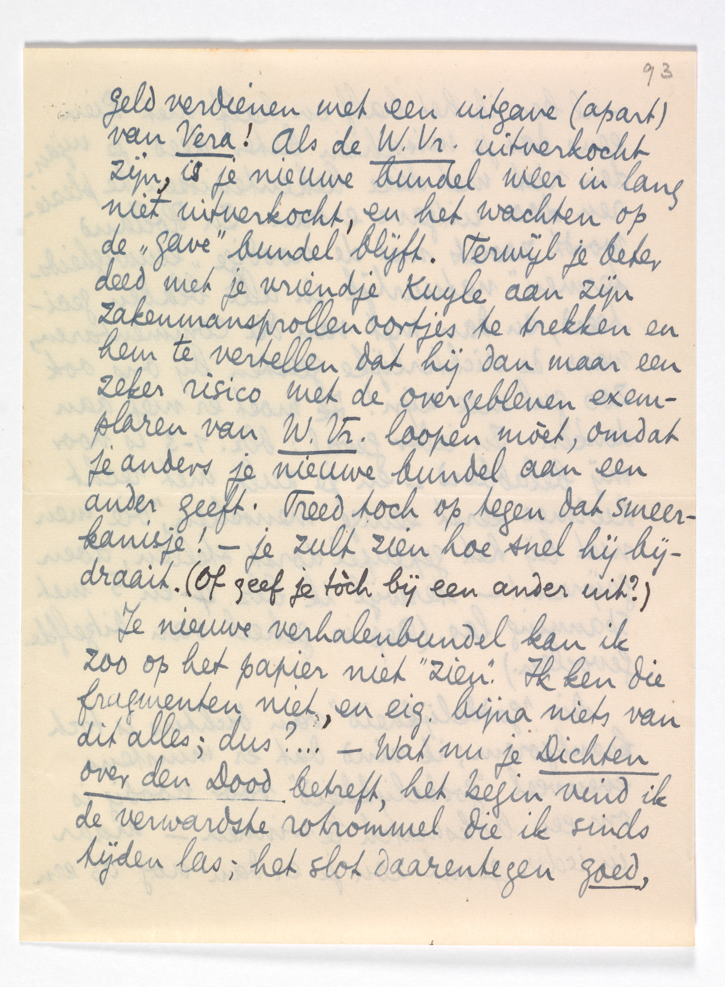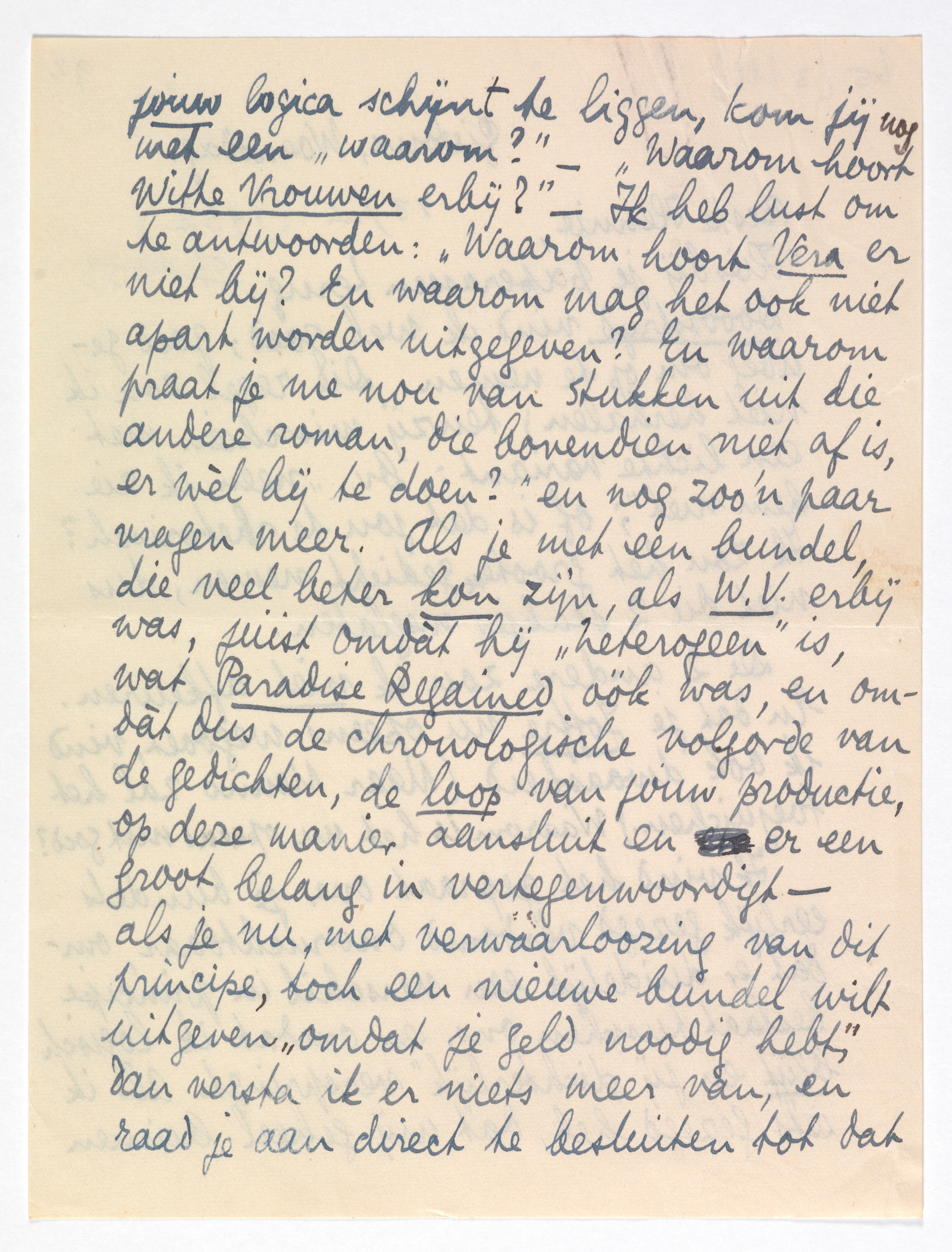 Ik vind het gepraat over je bundels eerlijk gezegd verdomd onvruchtbaar, omdat er duidelijk een verschil in principe bestaat tusschen ons, en omdat ik logisch blijf en jij ‘dichterlijk’ verspringt. Als ik iets gezegd heb, dat mij geheel binnen jouw logica schijnt te liggen, kom jij nog met een ‘waarom?’ - ‘Waarom hoort Witte Vrouwen erbij?’ - Ik heb lust om te antwoorden: ‘Waarom hoort Vera er niet bij? En waarom mag het ook niet apart worden uitgegeven? En waarom praat je me nou van stukken uit die andere roman,2236 die bovendien niet af is, er wèl bij te doen?’ en nog zoo'n paar vragen meer. Als je met een bundel die veel beter kon zijn, als W.V. erbij was, juist omdàt hij ‘heterogeen’ is, wat Paradise Regained óók was, en omdàt dus de chronologische volgorde van de gedichten, de loop van jouw productie, op deze manier aansluit en er een groot belang in vertegenwoordigt - als je nu met verwààrloozing van dit principe, toch een nieuwe bundel wilt uitgeven ‘omdat je geld noodig hebt’, dan versta ik er niets meer van, en raad je aan direct te besluiten tot dat geld verdienen met een uitgave (apart) van Vera! Als de W. Vr. uitverkocht zijn, is je nieuwe bundel weer in lang niet uitverkocht, en het wachten op de ‘gave’ bundel blijft. Terwijl je beter deed met je vriendje Kuyle aan zijn zakenmansprollenoortjes te trekken en hem te vertellen dat hij dan maar een zeker risico met de overgebleven exemplaren van W. Vr. loopen moèt, omdat je anders je nieuwe bundel aan een ander geeft. Treed toch op tegen dat smeerkanisje! - je zult zien hoe snel hij bijdraait. (Of geef je tòch bij een ander uit?)