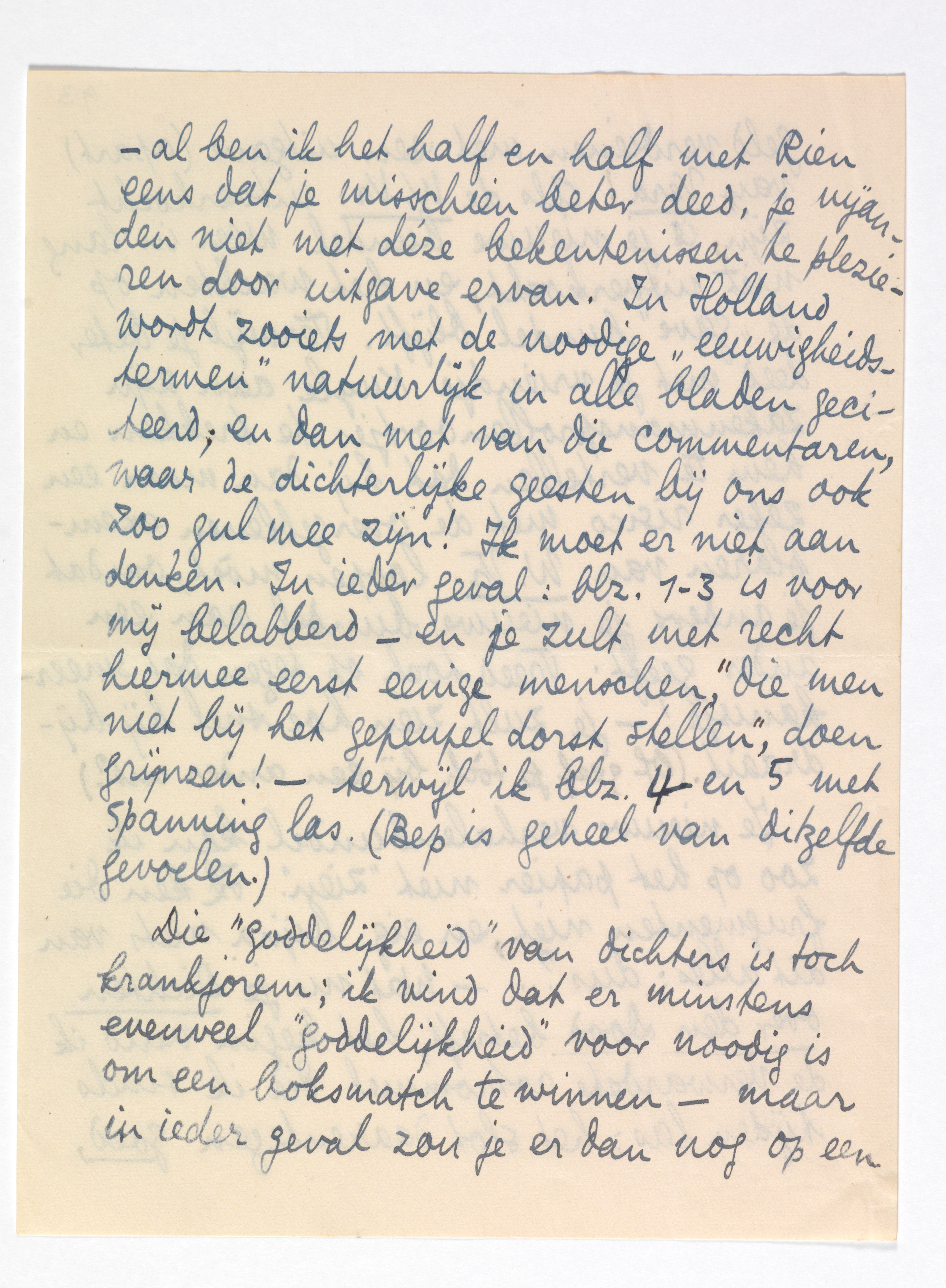 Die ‘goddelijkheid’ van dichters is toch krankjorem; ik vind dat er minstens evenveel ‘goddelijkheid’ voor noodig is om een boksmatch te winnen - maar in ieder geval zou je er dan nog op een andere manier over moeten spreken dan je het hier deed. En die Onze-Lieve-Heer die je ‘leenheer’ heet! Neen, ik kan daar alleen maar beroerd van worden; het is me te kras, en te griezelig spiritistisch!