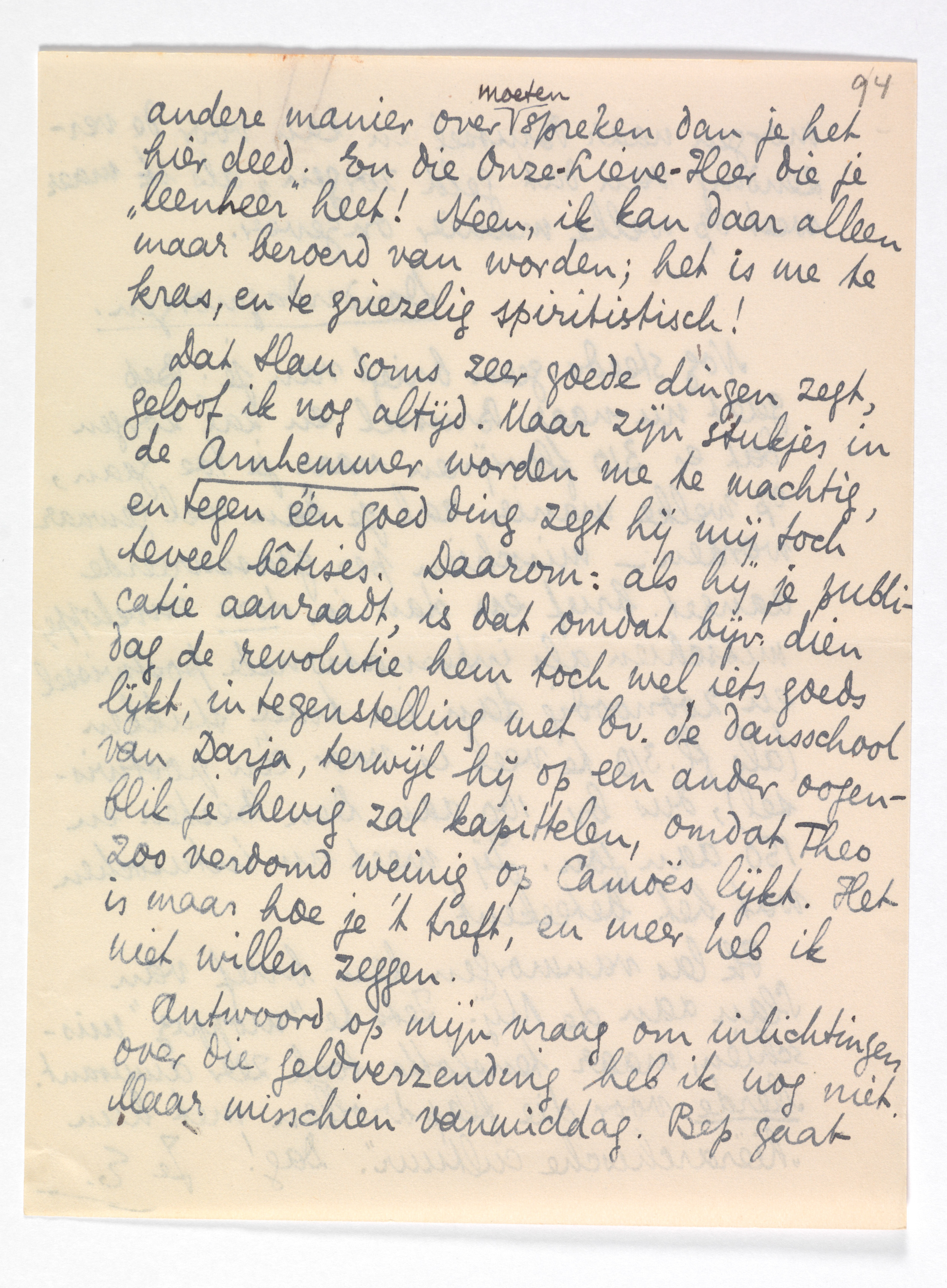Dat Slau soms zeer goede dingen zegt, geloof ik nog altijd. Maar zijn stukjes in de Arnhemmer worden me te machtig, en tegen één goed ding zegt hij mij toch teveel bêtises. Daarom: als hij je publicatie aanraadt, is dat omdat bijv. dien dag de revolutie hem toch wel iets goeds lijkt, in tegenstelling met bv. de dansschool van Darja, terwijl hij op een ander oogenblik je hevig zal kapittelen, omdat Theo zoo verdomd weinig op Camoës lijkt. Het is maar hoe je 't treft, en meer heb ik niet willen zeggen.
