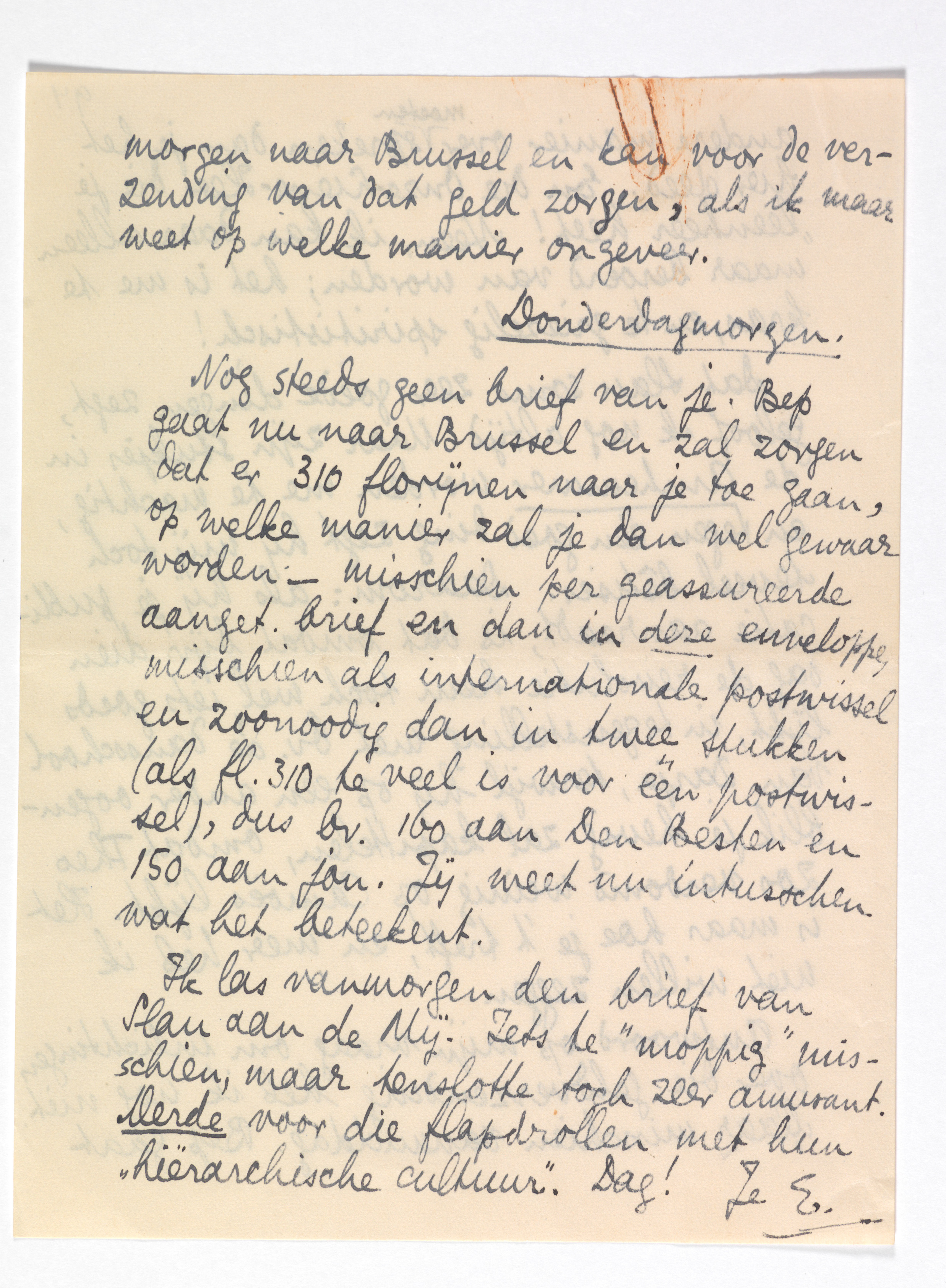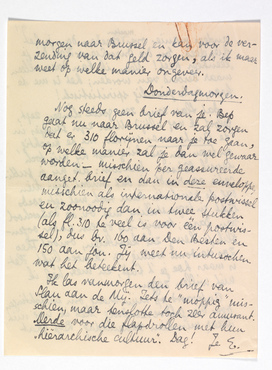 Nog steeds geen brief van je. Bep gaat nu naar Brussel en zal zorgen dat er 310 florijnen naar je toe gaan, op welke manier zal je dan wel gewaar worden - misschien per geassureerde aanget. brief en dan in deze enveloppe, misschien als internationale postwissel en zoonoodig dan in twee stukken (als fl. 310 te veel is voor één postwissel), dus bv. 160 aan Den Besten en 150 aan jou. Jij weet nu intusschen wat het beteekent.