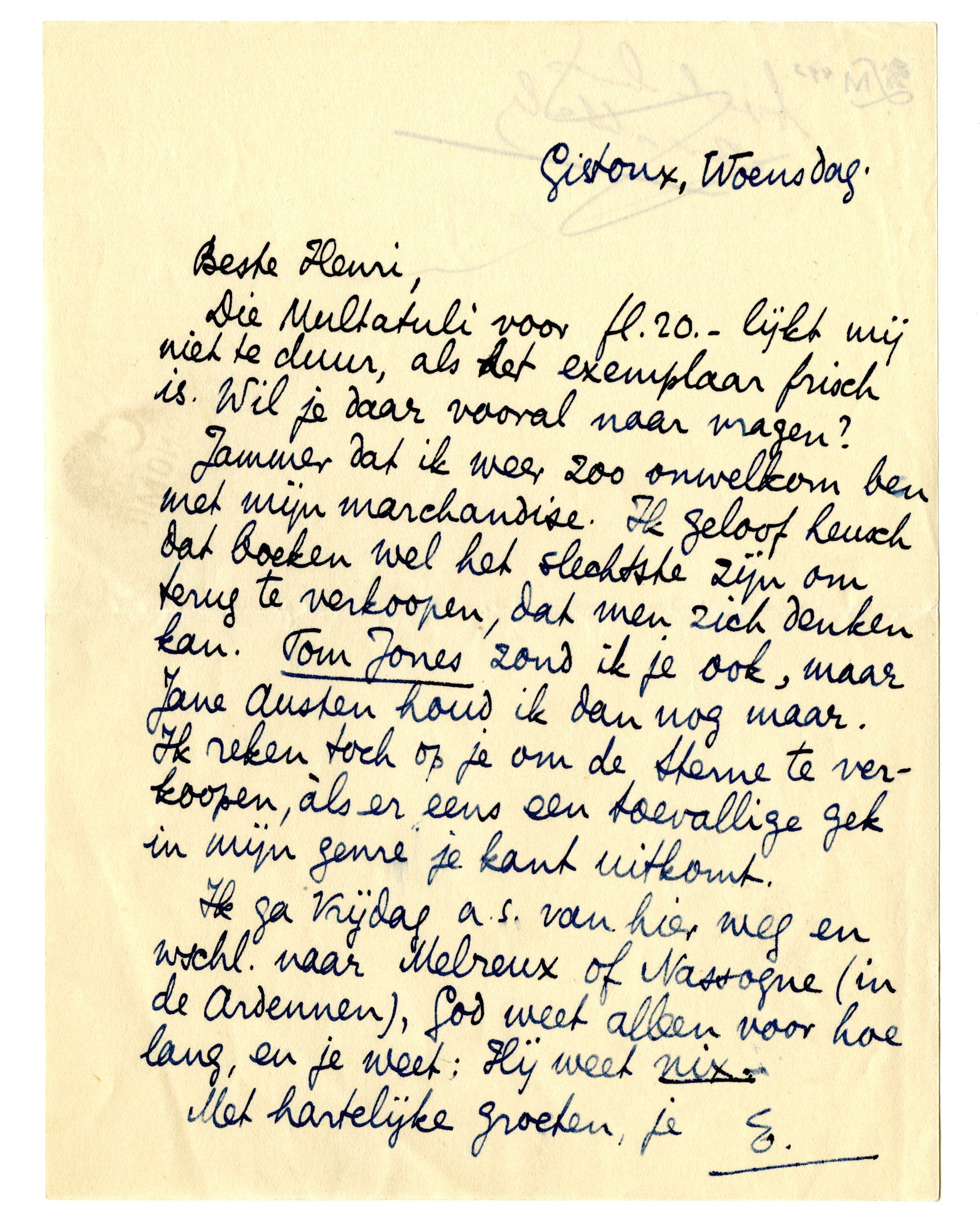 Jammer dat ik weer zoo onwelkom ben met mijn marchandise. Ik geloof heusch dat boeken wel het slechtste zijn om terug te verkoopen, dat men zich denken kan. Tom Jones zond ik je ook, maar Jane Austen houd ik dan nog maar. Ik reken toch op je om de Sterne te verkoopen, àls er eens een toevallige gek in mijn genre je kant uitkomt.