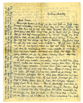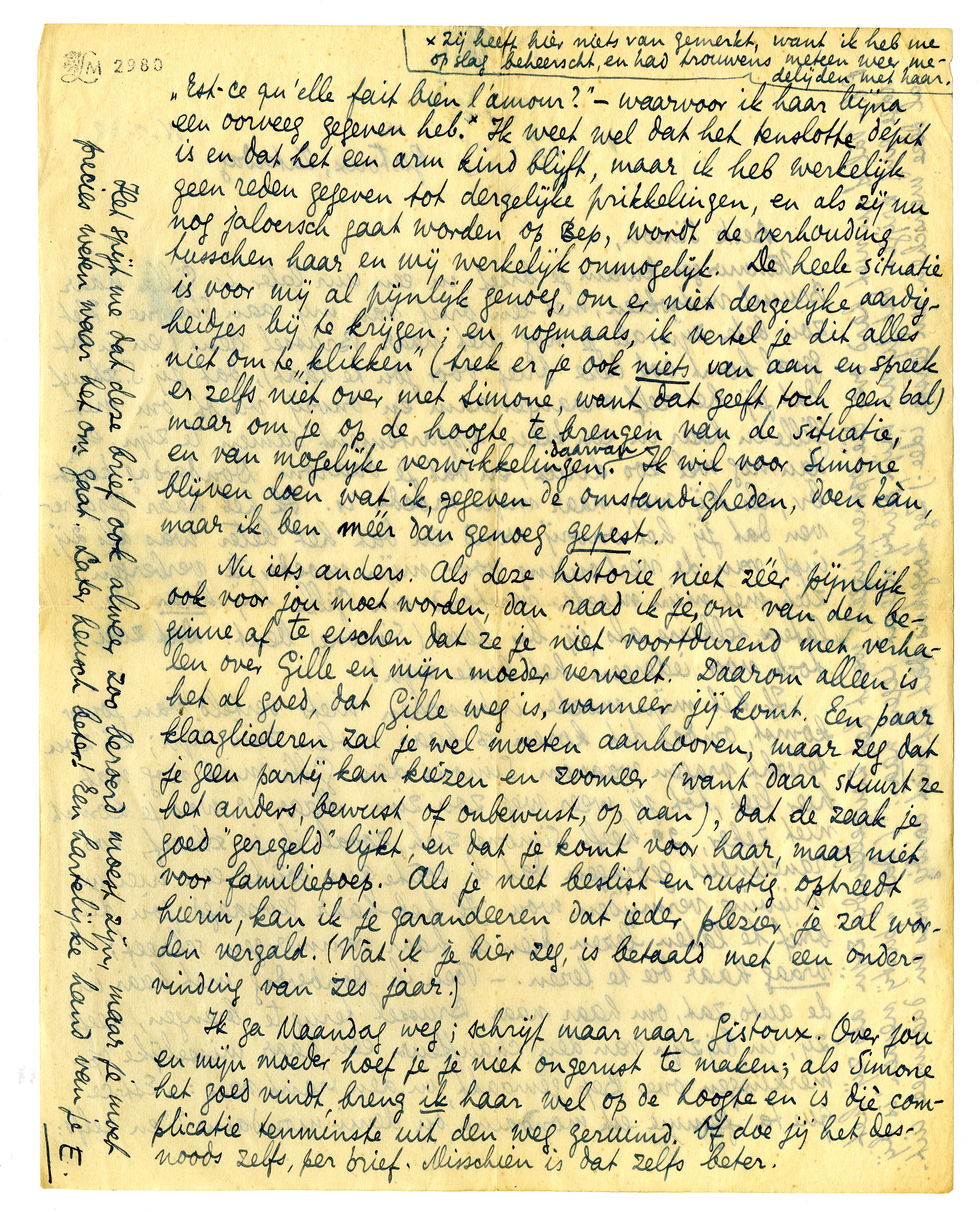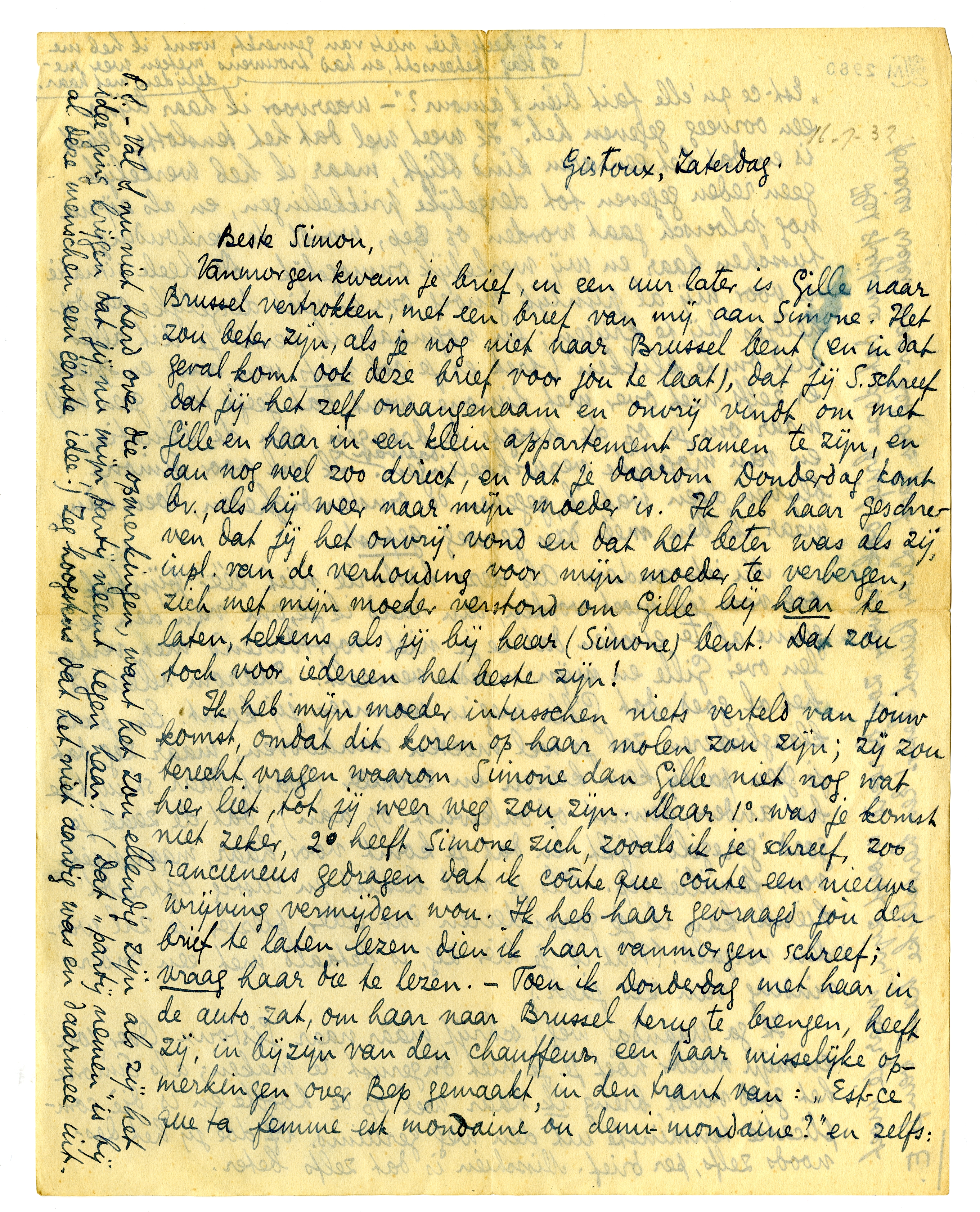 Vanmorgen kwam je brief, en een uur later is Gille naar Brussel vertrokken, met een brief van mij aan Simone. Het zou beter zijn, als je nog niet naar Brussel bent (en in dat geval komt ook deze brief voor jou te laat), dat jij S. schreef dat jij het zelf onaangenaam en onvrij vindt om met Gille en haar in een klein appartement samen te zijn, en dan nog wel zoo direct, en dat je daarom Donderdag komt bv., als hij weer naar mijn moeder is. Ik heb haar geschreven dat jij het onvrij vond en dat het beter was als zij, inpl. van de verhouding voor mijn moeder te verbergen, zich met mijn moeder verstond om Gille bij haar te laten, telkens als jij bij haar (Simone) bent. Dat zou toch voor iedereen het beste zijn!