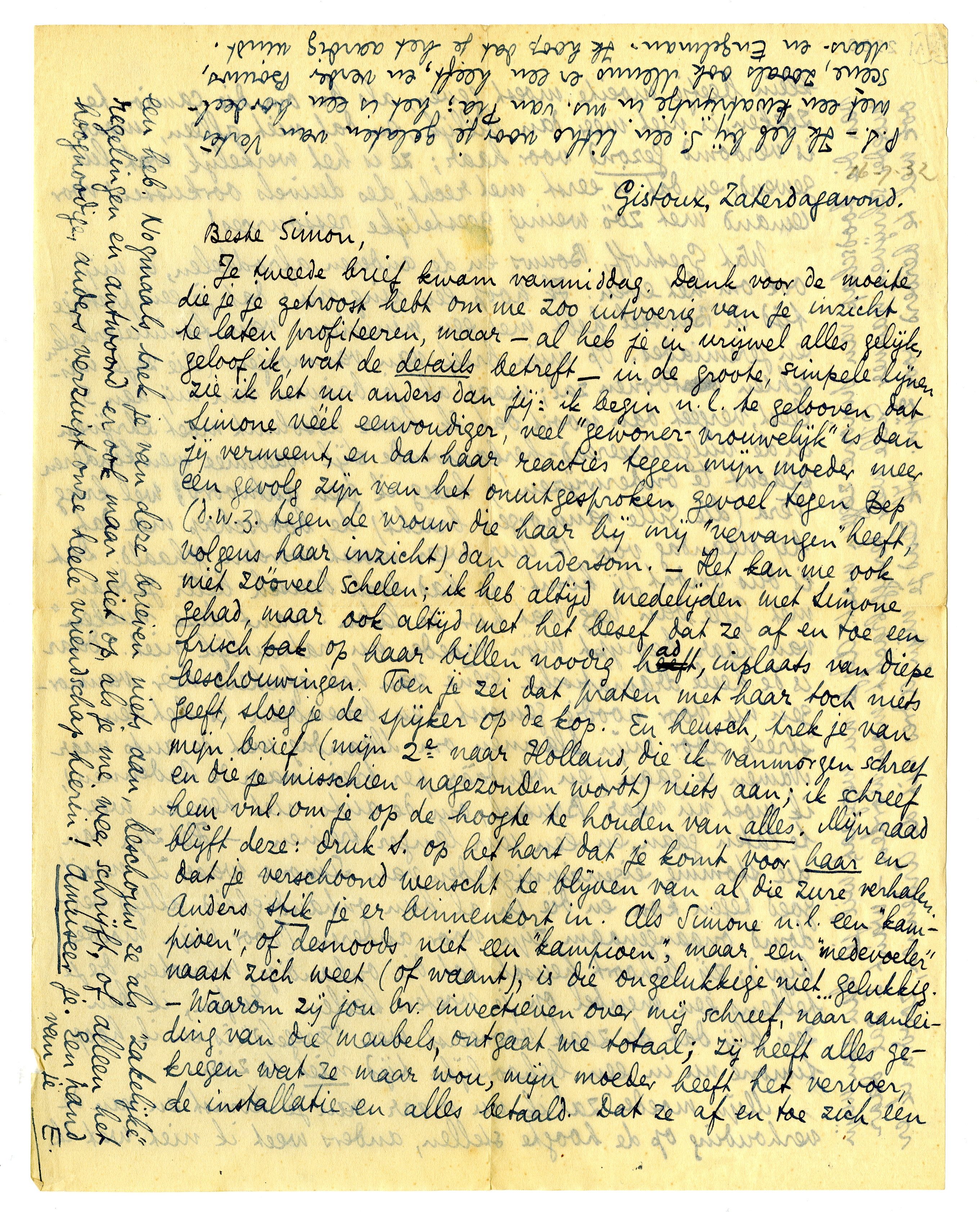 Je tweede brief kwam vanmiddag. Dank voor de moeite die je je getroost hebt om me zoo uitvoerig van je inzicht te laten profiteeren, maar - al heb je in vrijwel alles gelijk, geloof ik, wat de details betreft - in de groote, simpele lijnen zie ik het nu anders dan jij: ik begin n.l. te gelooven dat Simone véél eenvoudiger, veel ‘gewonervrouwelijk’ is dan jij vermeent, en dat haar reacties tegen mijn moeder meer een gevolg zijn van het onuitgesproken gevoel tegen Bep (d.w.z. tegen de vrouw die haar bij mij ‘vervangen’ heeft, volgens haar inzicht) dan andersom. - Het kan me ook niet zóóveel schelen; ik heb altijd medelijden met Simone gehad, maar ook altijd met het besef dat ze af en toe een frisch pak op haar billen noodig had, inplaats van diepe beschouwingen. Toen je zei dat praten met haar mijn brief (mijn 2e naar Holland, die ik vanmorgen schreef en die je misschien nagezonden wordt) niets aan; ik schreef hem vnl. om je op de hoogte te houden van alles. Mijn raad blijft deze: druk S. op het hart dat je komt voor haar en dat je verschoond wenscht te blijven van al die zure verhalen. Anders stik je er binnenkort in. Als Simone n.l. een ‘kampioen’, of desnoods niet een ‘kampioen’, maar een ‘medevoeler’ naast zich weet (of waant), is die ongelukkige niet... gelukkig. - Waarom zij jou bv. invectieven over mij schreef, naar aanleiding van die meubels, ontgaat me totaal; zij heeft alles gekregen wat ze maar wou, mijn moeder heeft het vervoer, de installatie en alles betaald. Dat ze af en toe zich een klein beetje moeite moest geven, als bv. om die camion te zoeken, is niet meer dan billijk, en dat niet alleen, maar is verdomd gezond voor haar; ze is het werkelijk wat lui gewend, en dat is eerst met recht ‘des duivels oorkussen’ voor iemand met zóó weinig geestelijke ressources!