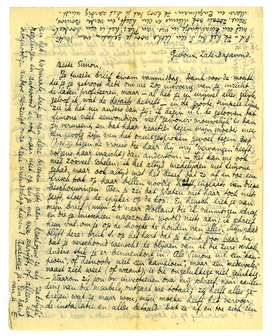 Mijn moeder zal ik nu maar van je komst en van de verhouding op de hoogte stellen, anders weet ik niet wat ik van die boodschap van Simone zeggen moet. Als je nu weggaat, wil jij dan aan mijn moeder schrijven wanneer Gille weer teruggebracht moet worden - want S. zal daar ook wel te beroerd voor zijn. Ik zend je mijn adres uit de Ardennen, zoodra ik er een heb. Nogmaals, trek je van deze brieven niets aan, beschouw ze als ‘zakelijke’ regelingen en antwoord er ook maar niet op, als je me weer schrijft, of alleen het hoognoodige, anders verzuipt onze heele vriendschap hierin! Amuseer je. Een hand van je