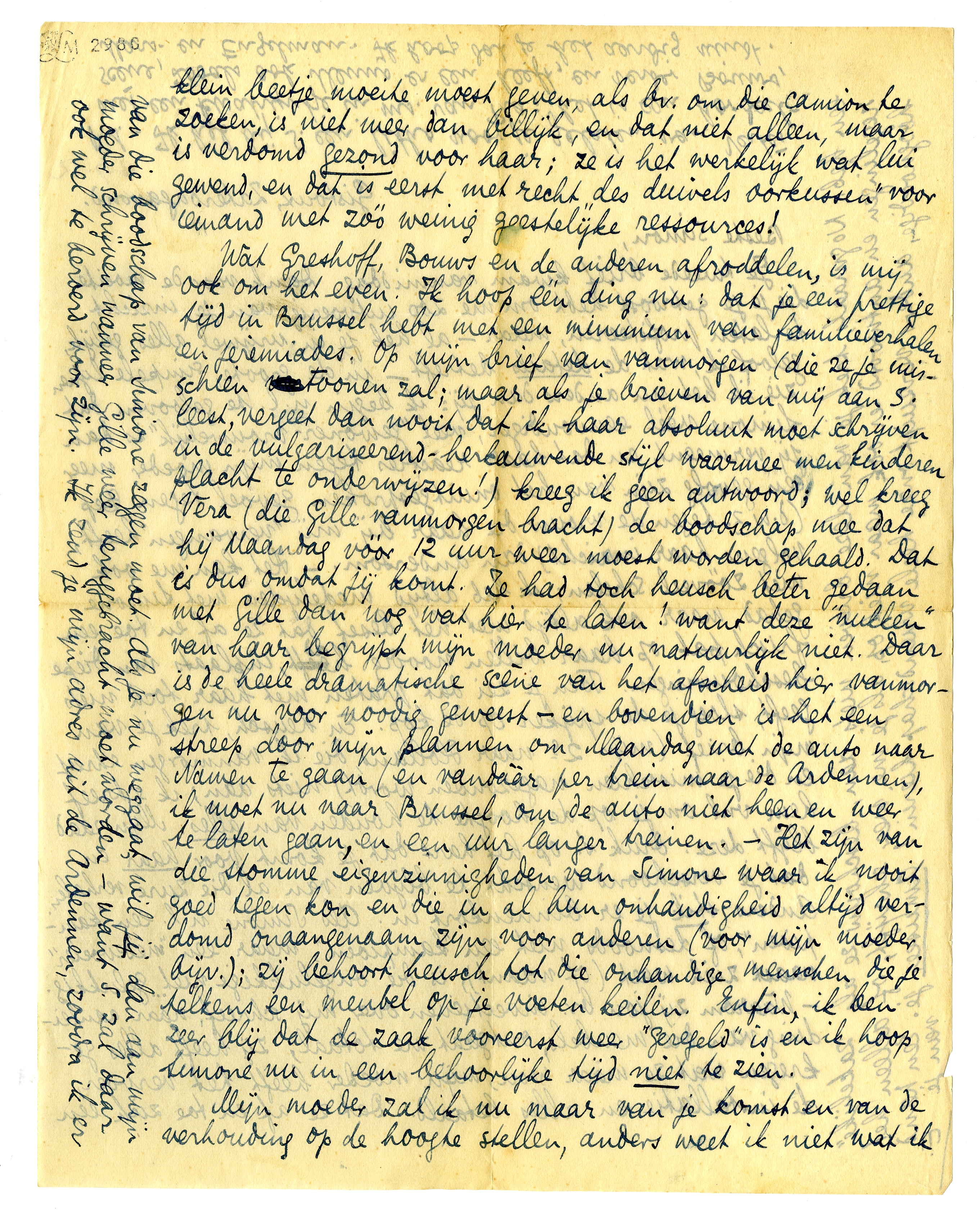Wat Greshoff, Bouws en de anderen afroddelen, is mij ook om het even. Ik hoop één ding nu: dat je een prettige tijd in Brussel hebt met een minimum van familieverhalen en jeremiades. Op mijn brief van vanmorgen (die ze je misschien toonen zal; maar als je brieven van mij aan S. leest, vergeet dan nooit dat ik haar absoluut moet schrijven in de vulgariseerend-herkauwende stijl waarmee men kinderen placht te onderwijzen!) kreeg ik geen antwoord; wel kreeg Vera (die Gille vanmorgen bracht) de boodschap mee dat hij Maandag vòòr 12 uur weer moest worden gehaald. Dat is dus omdat jij komt. Ze had toch heusch beter gedaan met Gille dan nog wat hier te laten! want deze ‘nukken’ van haar begrijpt mijn moeder nu natuurlijk niet. Daar is de heele dramatische scène van het afscheid hier vanmorgen nu voor noodig geweest - en bovendien is het een streep door mijn plannen om Maandag met de auto naar Namen te gaan (en vandààr per trein naar de Ardennen), ik moet nu naar Brussel, om de auto niet heen en weer te laten gaan, en een uur langer treinen. - Het zijn van die stomme eigenzinnigheden van Simone waar ik nooit goed tegen kon en die in al hun onhandigheid altijd verdomd onaangenaam zijn voor anderen (voor mijn moeder bijv.); zij behoort heusch tot die onhandige menschen die je telkens een meubel op je voeten keilen. Enfin, ik ben zeer blij dat de zaak vooreerst weer ‘geregeld’ is en ik hoop Simone nu in een behoorlijke tijd niet te zien.