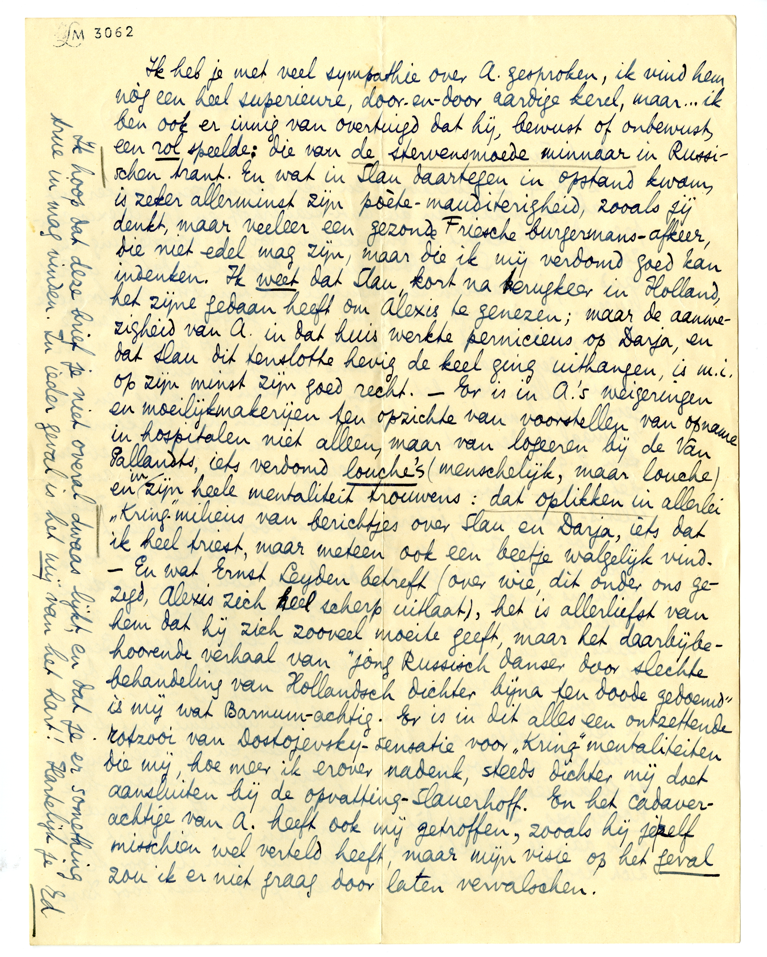 Ik schreef je gisteravond, en werd vanmorgen wakker met een akelige smaak van die anti-Slauerhoff en pro-Alexis-campagne2294 die zich schijnt te ontwikkelen. Bv. de voorstelling als zou Darja bij Slau hebben kunnen blijven omdat A. in Holland zat, is drastisch-sentimenteel en tenslotte een formeele leugen. Darja heeft Alexis uit Parijs geroepen om hem te helpen, dat zij dit onvoldoende deed is iets anders; maar in ieder geval zat D. in Merano2295 omdat zij zwanger was, en niet alleen voor het plezier van Slau! Ik krijg een wee gevoel als ik merk hoe allerlei menschen het volkomen normaal vinden dat iemand zijn vrouw bij zich hebben kan, z.g. door de edele bemoeienis van een vorige amant; het is door-en-door valsch en alleen gebaseerd op de ziekelijke Alexis-historie, die iedereen opeens voor hem inneemt. En dan nòg: als A. iets in Holland deed, was het voor Darja, opdat zij niet, zwanger zijnde, lessen zou geven, zooals zij trouwens nu ook veel te lang deed, of opdat zij niet, direct na haar bevalling, weer naar school moest. Behalve Alexis was immers ook Hertha aangesteld; en of die nu een prul is als ‘organisator’ of niet, zij zat er toch niet om vliegen te vangen? - Ik wil aannemen dat Slau in vele opzichten onhebbelijk is geweest, en zijn krenterigheid is nu ook al alomvermaard; maar 1o. weet niemand hoe de financiën van die dansschool zijn en of economie niet noodig was, 2o. gaat dàt niemand aan; 3o. verandert dat niets aan de valsche voorstelling als zou A. voor Slau zich doodgewerkt hebben en niet, op zijn best, voor Darja.
