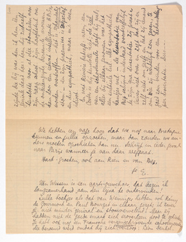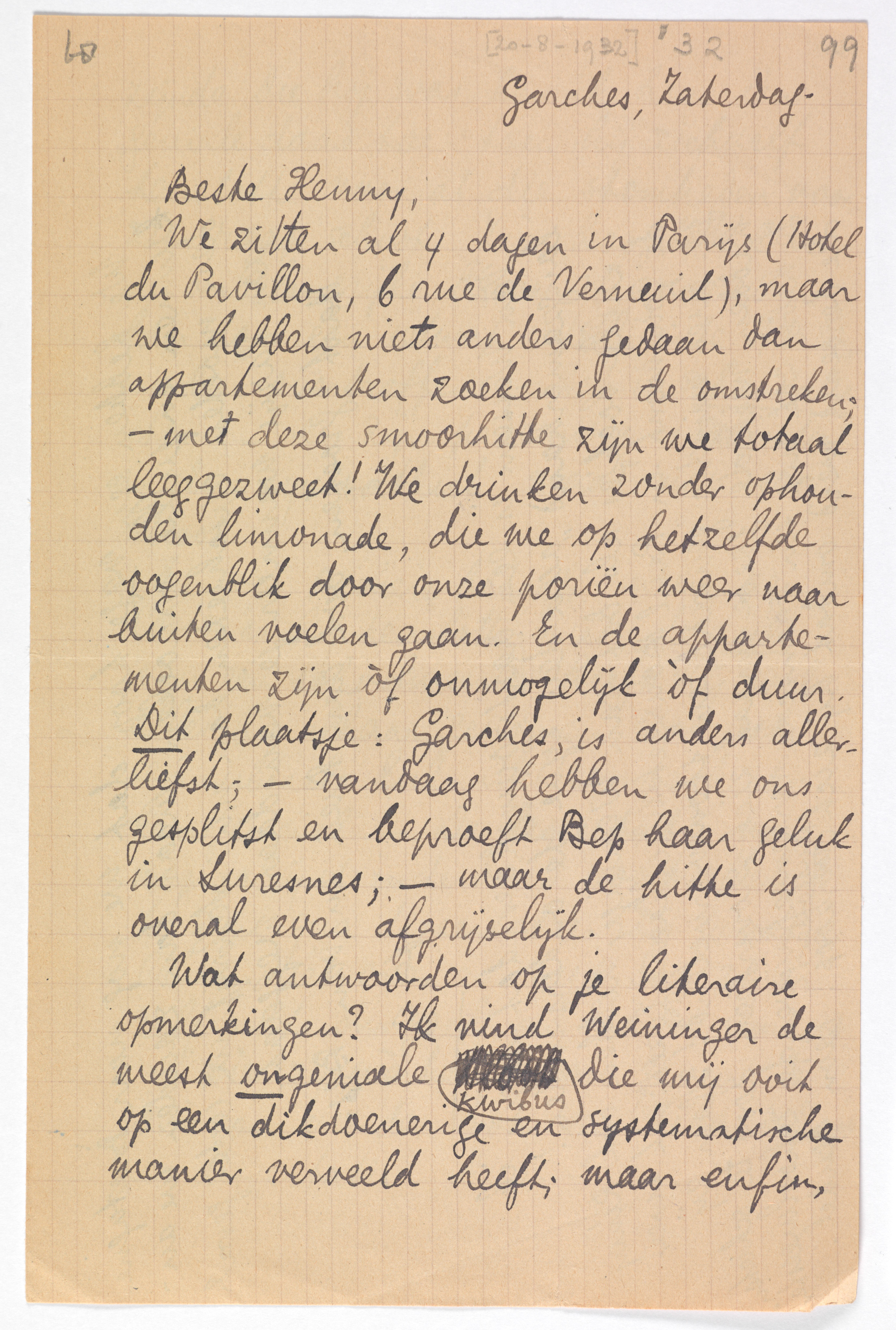We zitten al 4 dagen in Parijs (Hotel du Pavilion, 6 rue de Verneuil), maar we hebben niets anders gedaan dan appartementen zoeken in de omstreken; - met deze smoorhitte zijn we totaal leeggezweet! We drinken zonder ophouden limonade, die we op hetzelfde oogenblik door onze poriën weer naar buiten voelen gaan. En de appartementen zijn òf onmogelijk òf duur. Dit plaatsje: Garches, is anders allerliefst; - vandaag hebben we ons gesplitst en beproeft Bep haar geluk in Suresnes; - maar de hitte is overal even afgrijselijk.