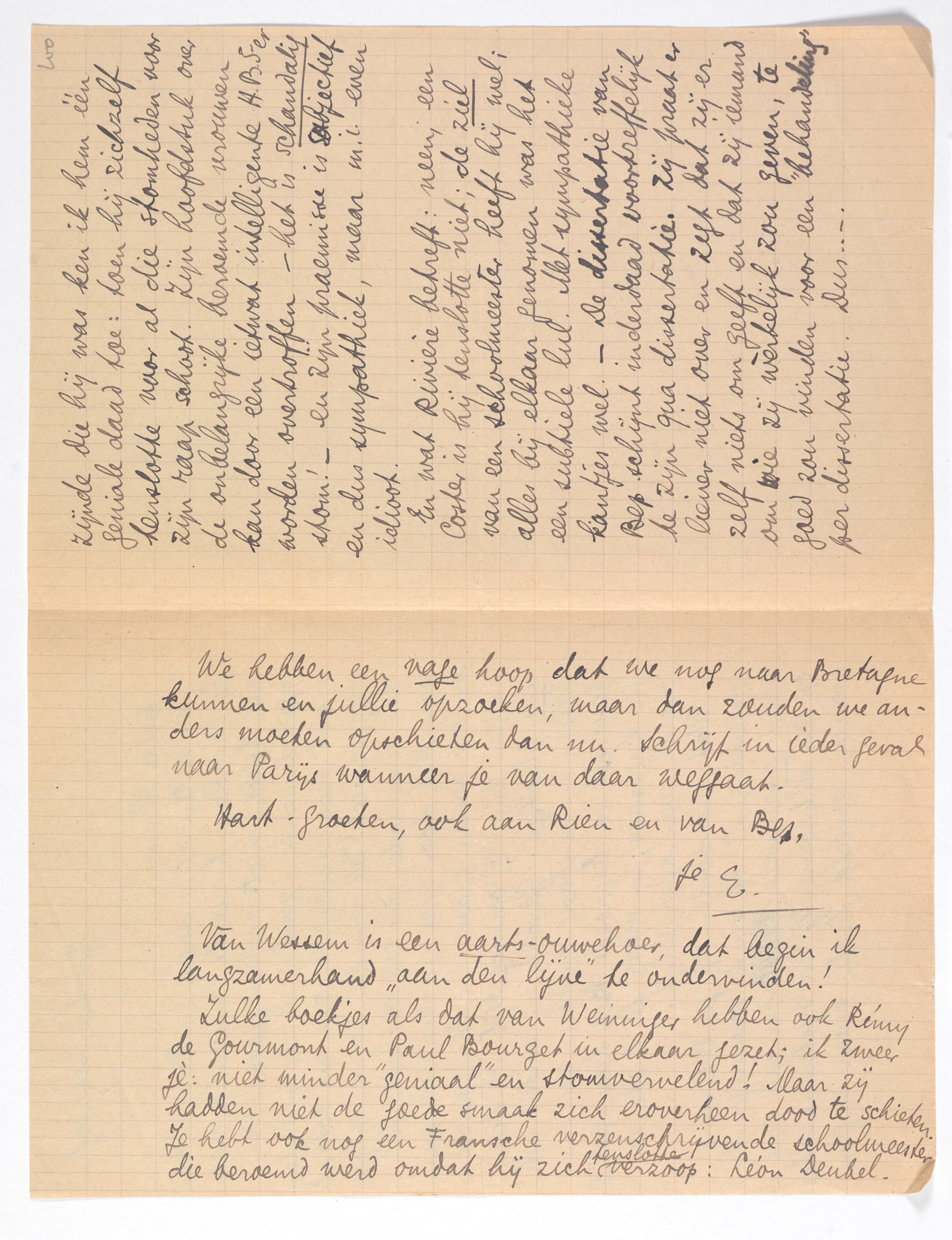 Wat antwoorden op je literaire opmerkingen? Ik vind Weininger de meest ongeniale kwibus die mij ooit op een dikdoenerige en systematische manier verveeld heeft; maar enfin, zijnde die hij was ken ik hem één geniale daad toe: toen hij zichzelf tenslotte voor al die stomheden voor zijn raap schoot. Zijn hoofdstuk over de onbelangrijke beroemde vrouwen kan door een ietwat intelligente H.B.S.-er worden overtroffen - het is schandalig stom! - en zijn praemisse is subjectief en dus sympathiek, maar m.i. even idioot.