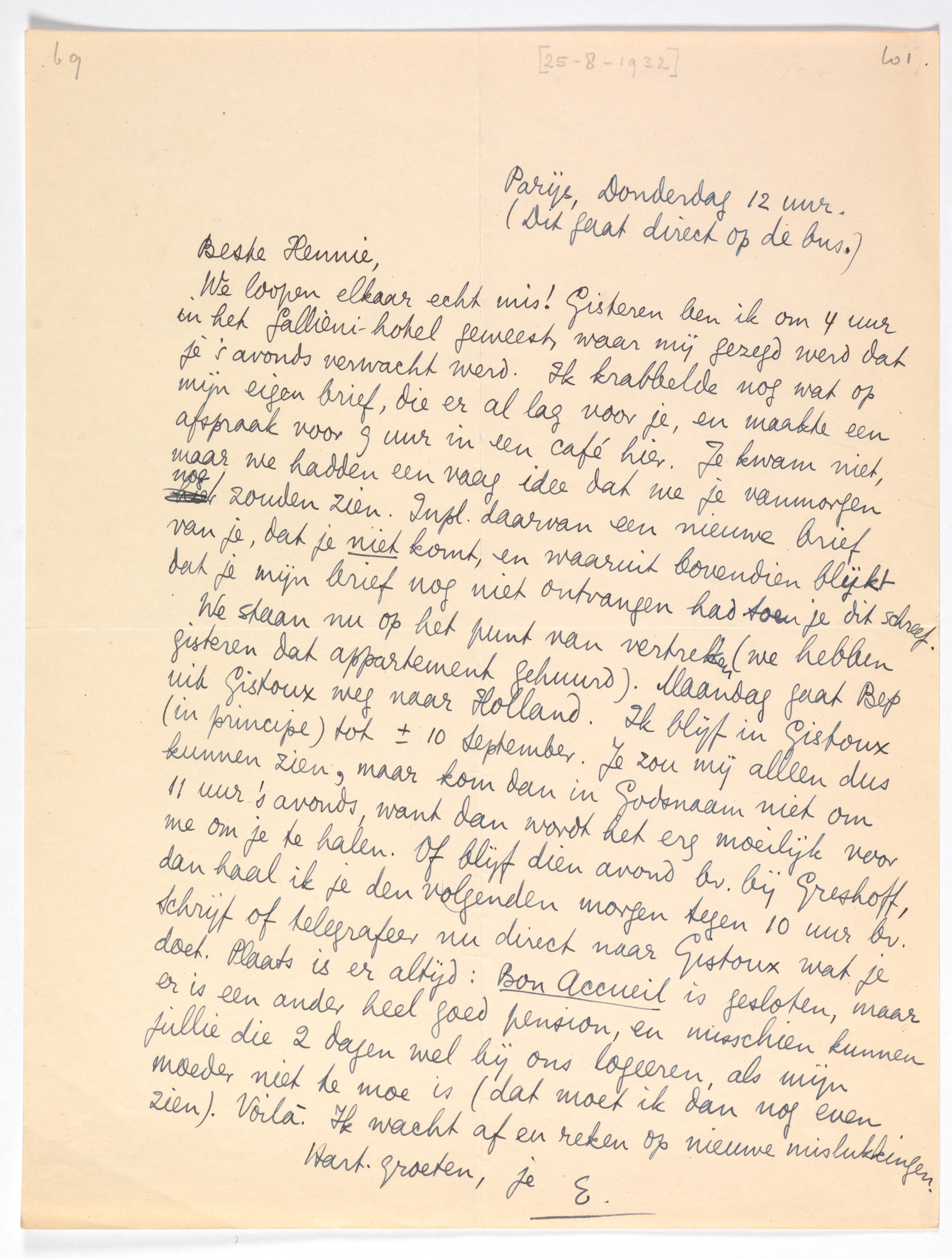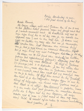 We loopen elkaar echt mis! Gisteren ben ik om 4 uur in het Gallieni-hotel geweest, waar mij gezegd werd dat je 's avonds verwacht werd. Ik krabbelde nog wat op mijn eigen brief, die er al lag voor je, en maakte een afspraak voor 9 uur in een café hier. Je kwam niet, maar we hadden een vaag idee dat we je vanmorgen nog zouden zien. Inpl. daarvan een nieuwe brief van je, dat je niet komt, en waaruit bovendien blijkt dat je mijn brief nog niet ontvangen had toen je dit schreef.