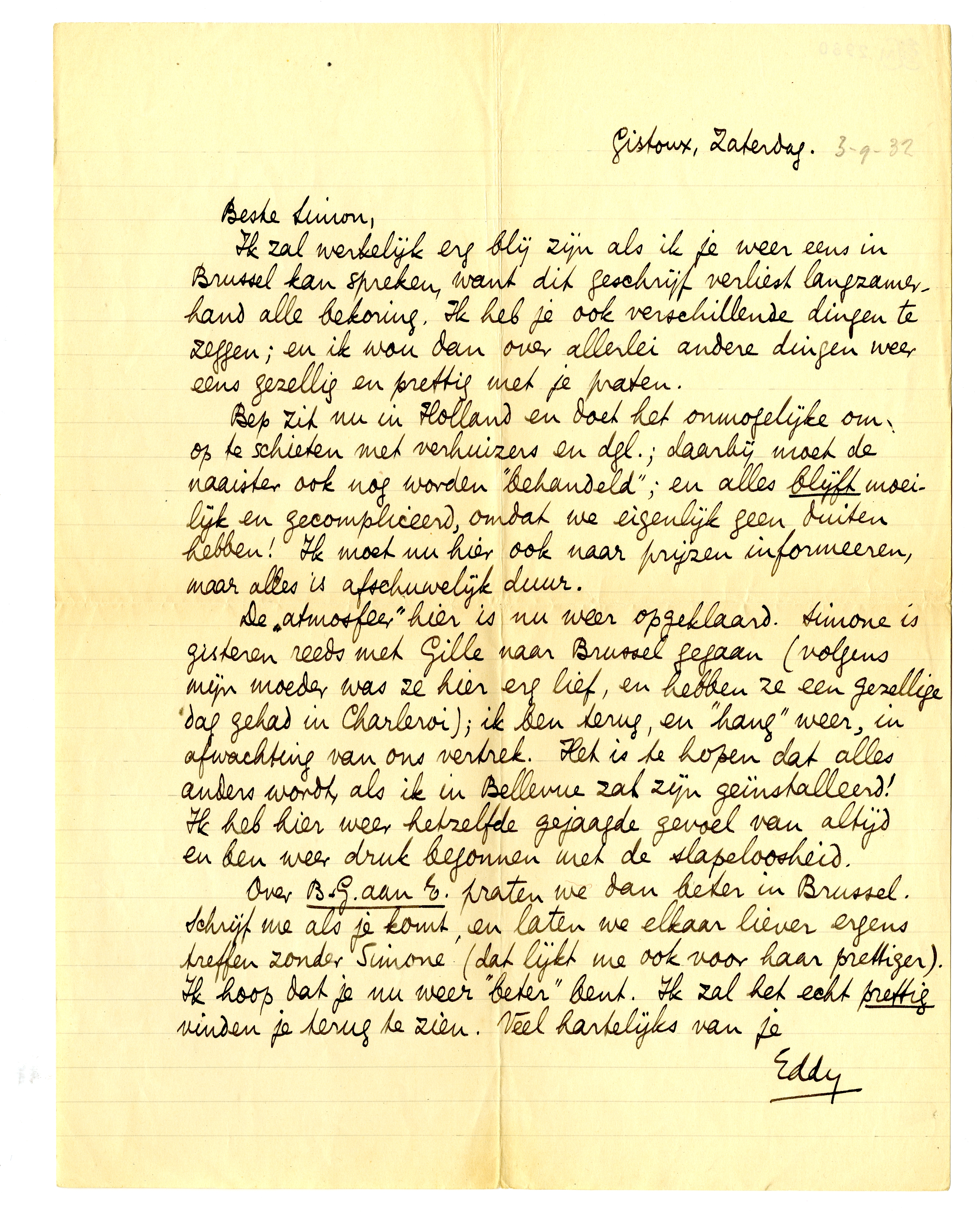 Over B.G. aan E. praten we dan beter in Brussel. Schrijf me als je komt, en laten we elkaar liever ergens treffen zonder Simone (dat lijkt me ook voor haar prettiger). Ik hoop dat je nu weer ‘beter’ bent. Ik zal het echt prettig vinden je terug te zien. Veel hartelijks van je