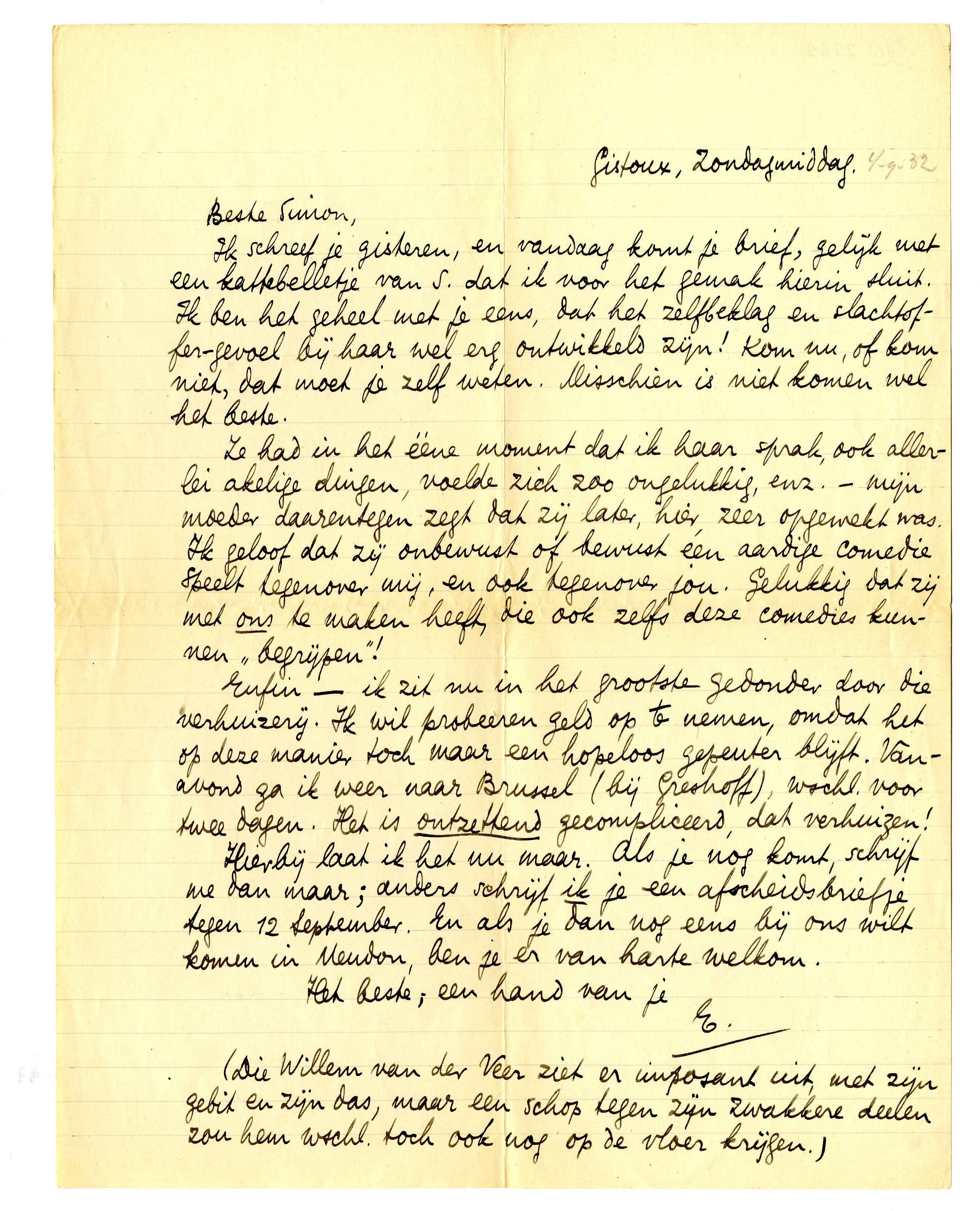 Ik schreef je gisteren, en vandaag komt je brief, gelijk met een kattebelletje van S. dat ik voor het gemak hierin sluit. Ik ben het geheel met je eens, dat het zelfbeklag en slachtoffer-gevoel bij haar wel erg ontwikkeld zijn! Kom nu, of kom niet, dat moet je zelf weten. Misschien is niet komen wel het beste.