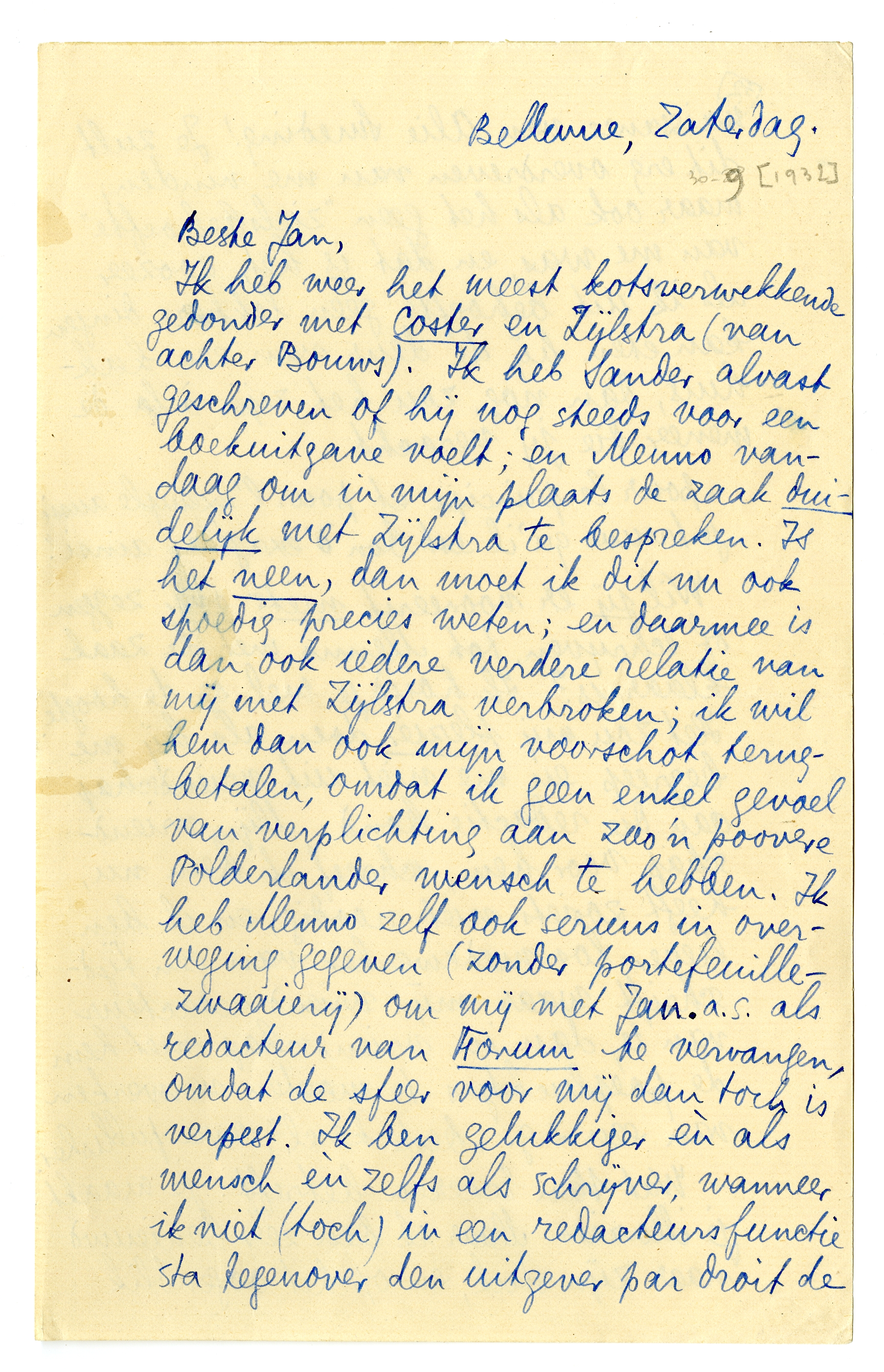 Wil jij er vooreerst niets over zeggen of schrijven, tot Menno met de zaak klaar is? Ik houd je wel op de hoogte. Het zou mij plezier doen als hij me begreep en me niet uit vriendschap aan die redactie bond. Mijn vriendschap voor hem, schreef ik hem nu, heeft zooiets niet noodig, en ik ben liever los medewerker van een tijdschrift waar mijn vriend redacteur van is, dan in vriendschap met hem de poepluchtjes te moeten verwerken van een z.g. ‘beste kerel’, onze publisher.